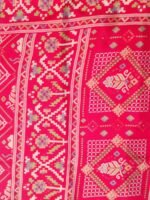 Pink fancy saree, featuring intricate Patola-inspired motifs woven across the body and border. The saree showcases delicate white and gold Butti designs on a lustrous pink base, giving it a vibrant yet graceful appeal. The border and pallu are adorned with traditional geometric and floral patterns, enhancing the saree’s rich ethnic charm. Crafted from premium soft fabric, this saree drapes beautifully and feels lightweight.