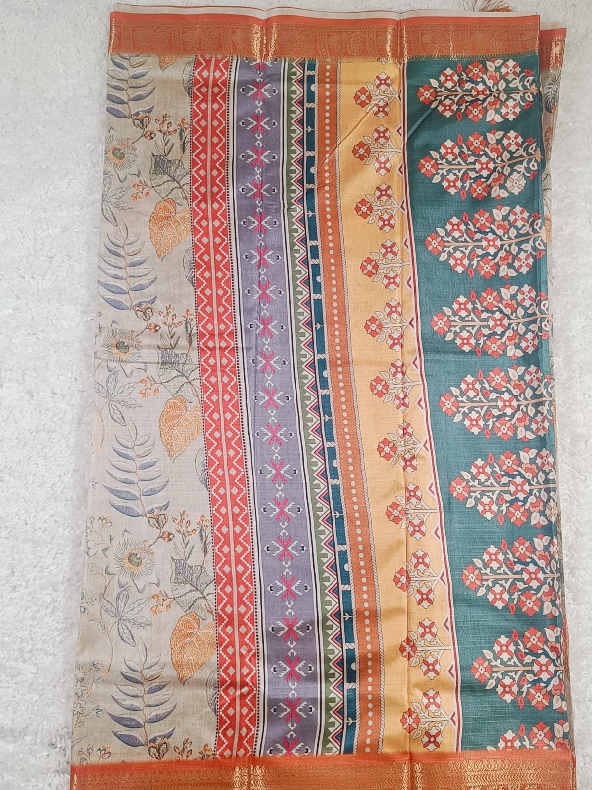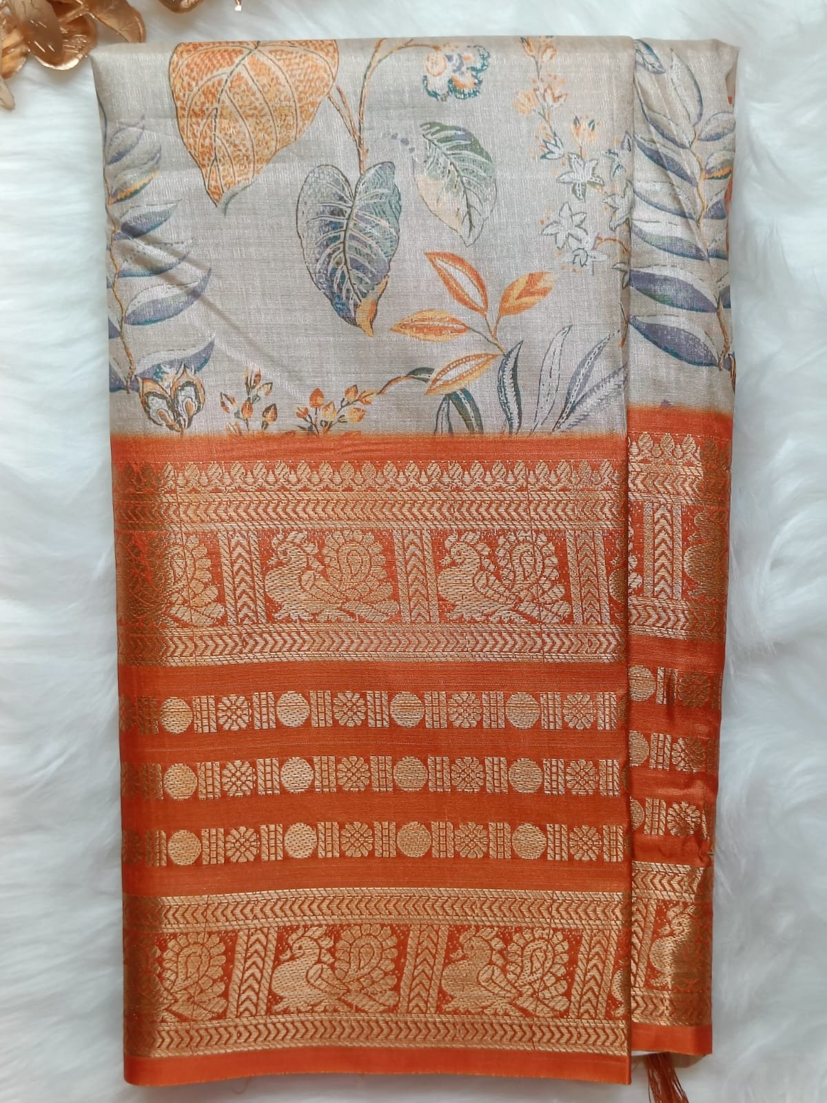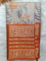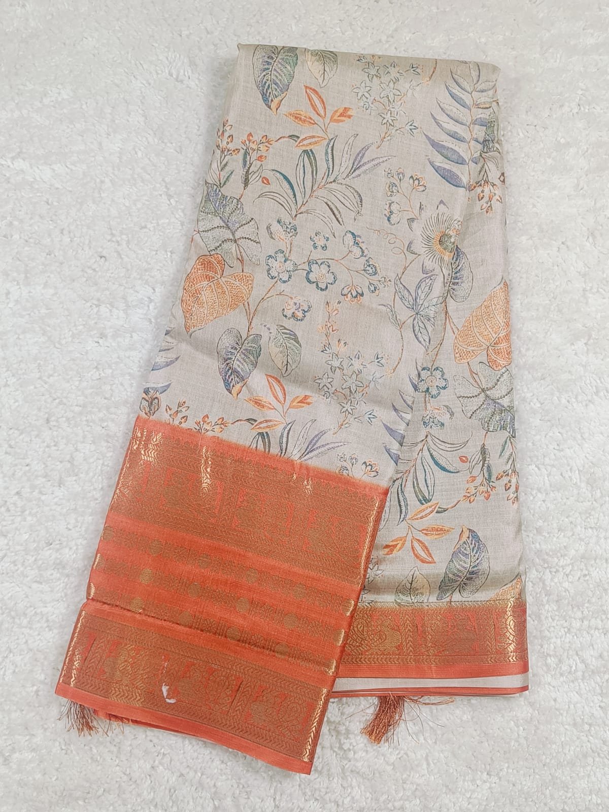 Fabric & Base Color: The saree has a subtle beige/cream base that highlights its floral and patterned designs, giving it a soft and elegant appearance. The body features delicate floral prints in pastel shades—orange, green, lavender, and grey. These motifs bring a fresh, modern touch while retaining a classic charm.