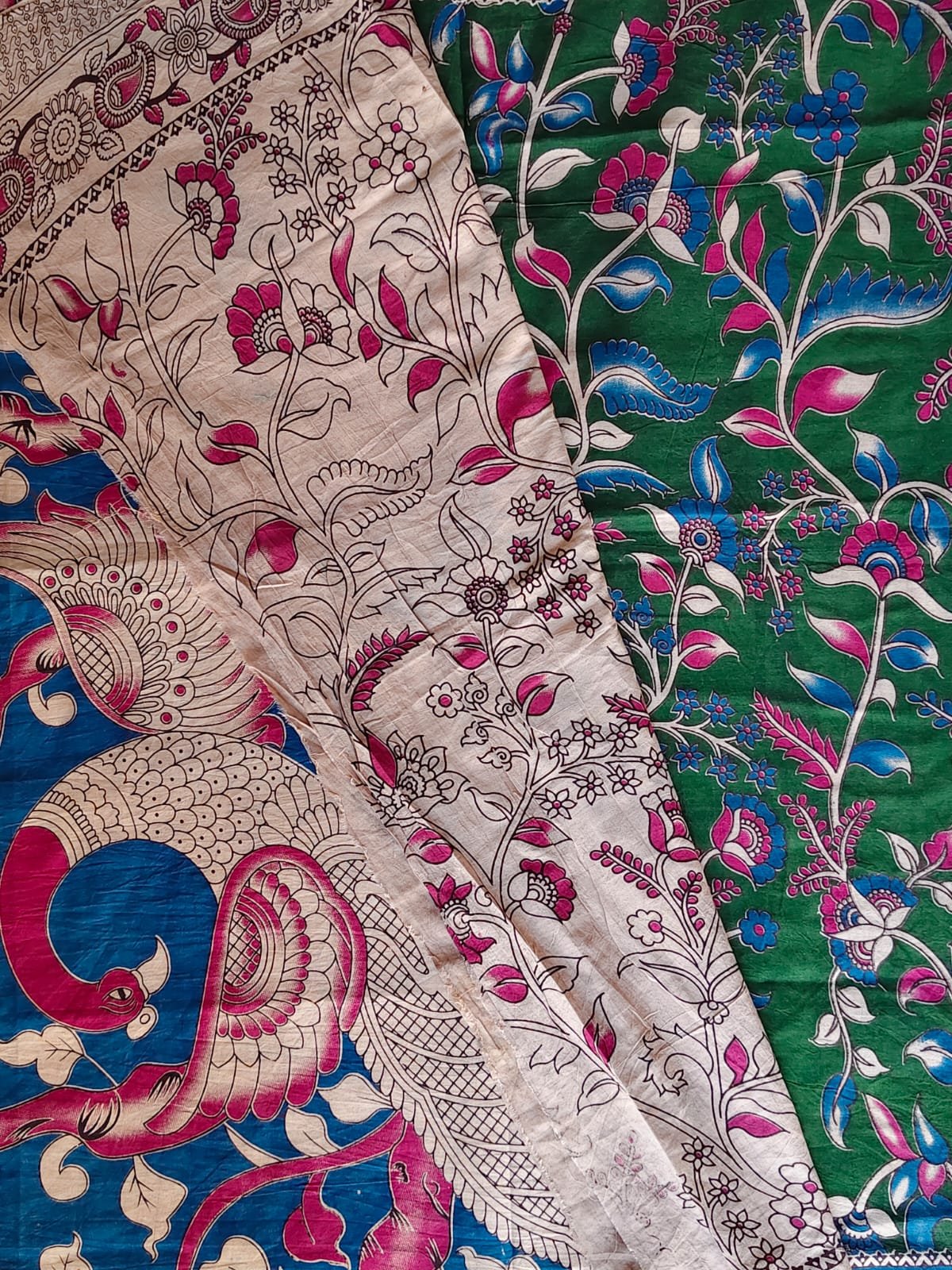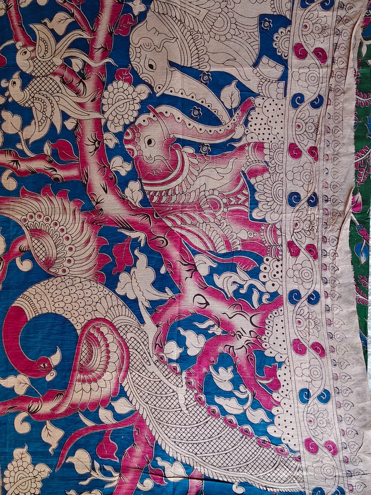 The highlight of this saree is its striking pallu and border, featuring detailed traditional Kalamkari artwork with majestic bird and nature-inspired patterns in contrasting royal blue and soft beige tones. The finely detailed prints add depth and character, making it perfect for festive occasions, cultural events, and elegant gatherings.