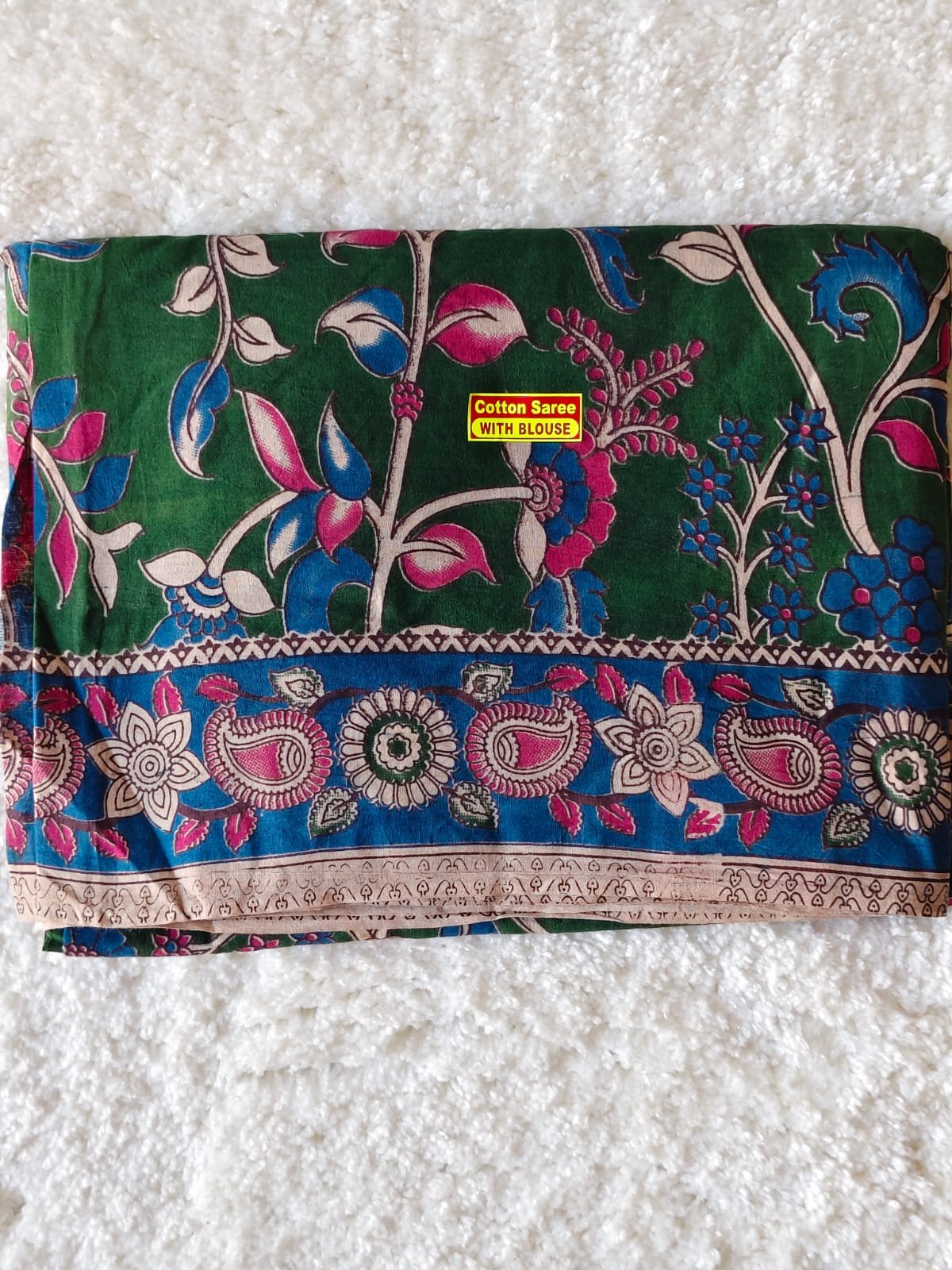 Color: Deep green with royal blue and beige contrast border
