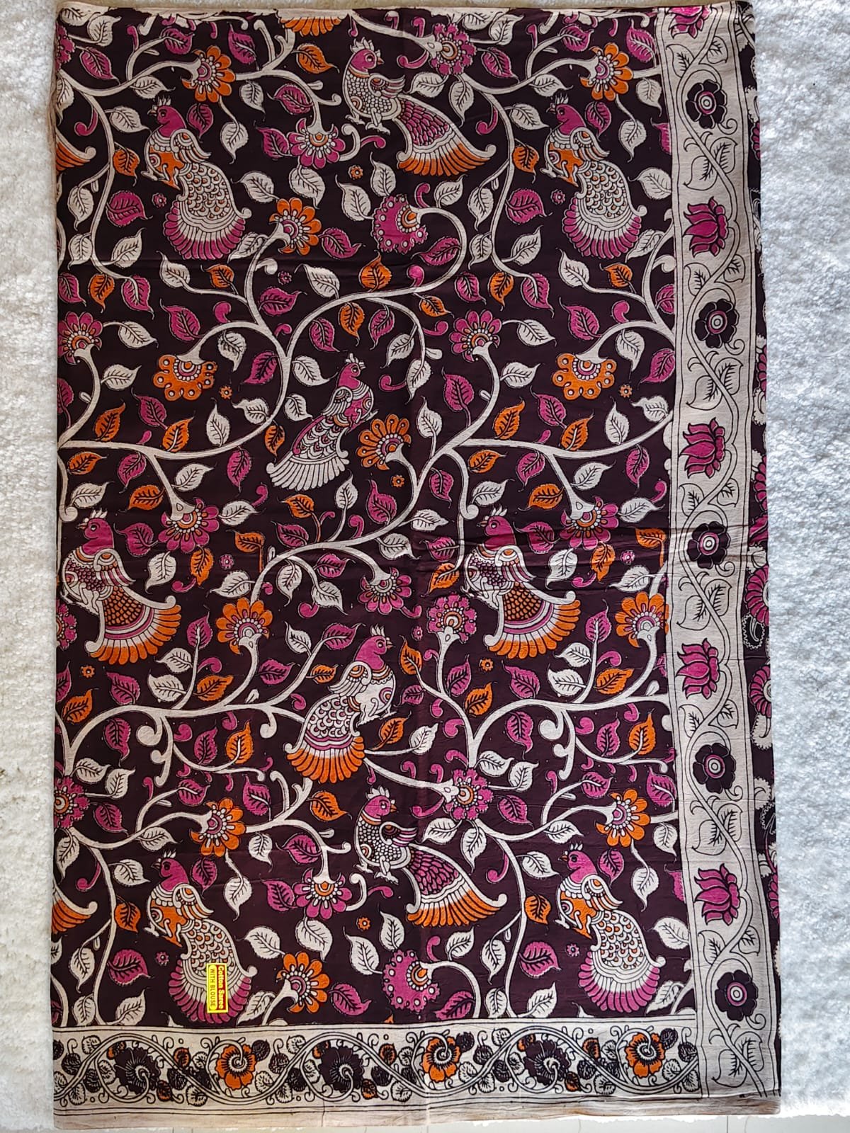 AA1014 Elegant Brown & Pink Kalamkari Cotton Saree with Peacock Motifs