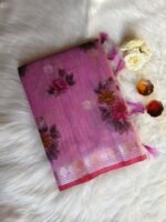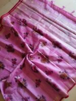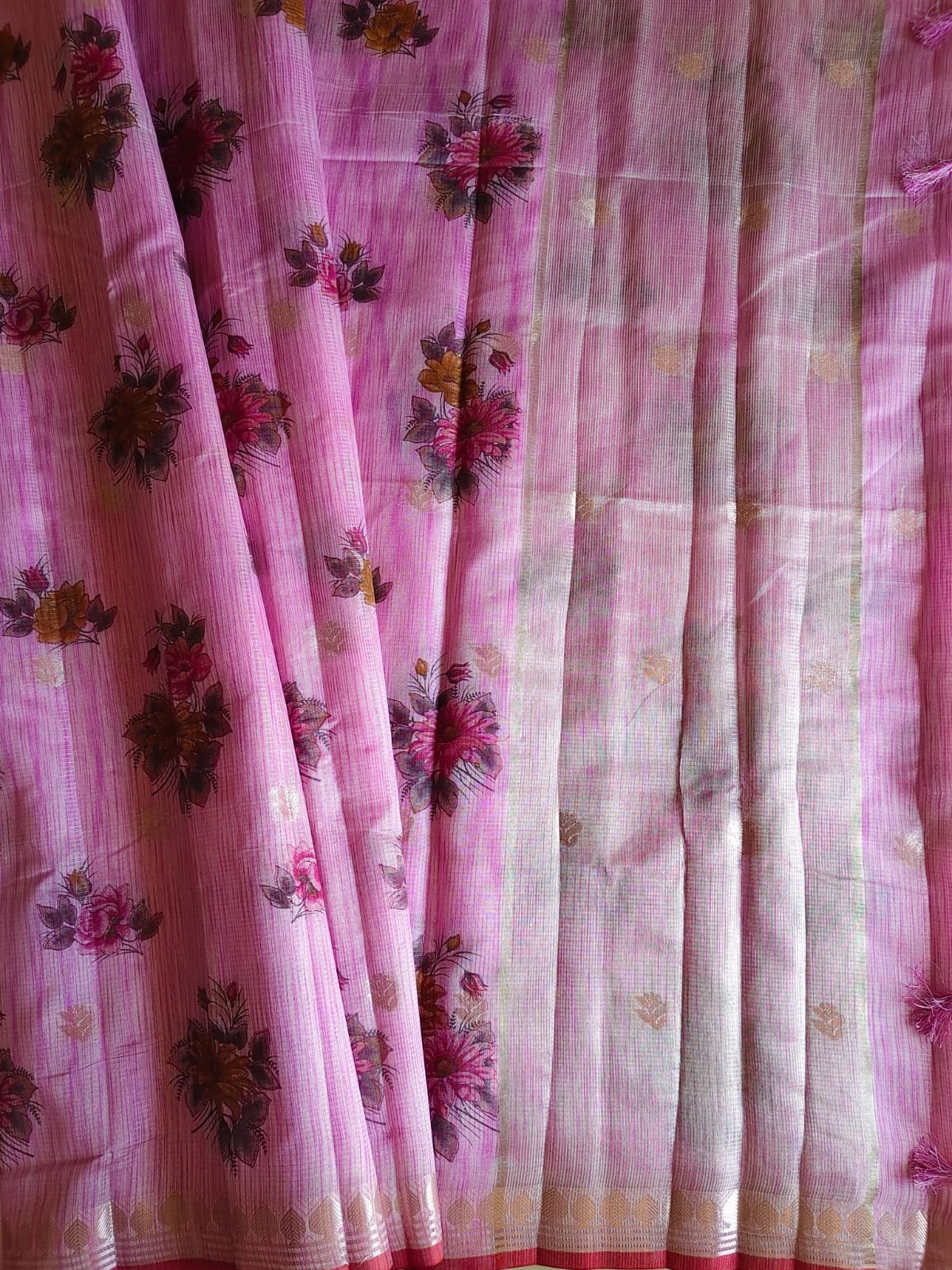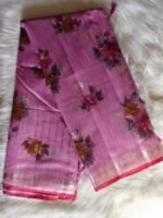 AA1025 Rose Pink Kota Doria Cotton Silk Saree with Floral Print & Zari Border