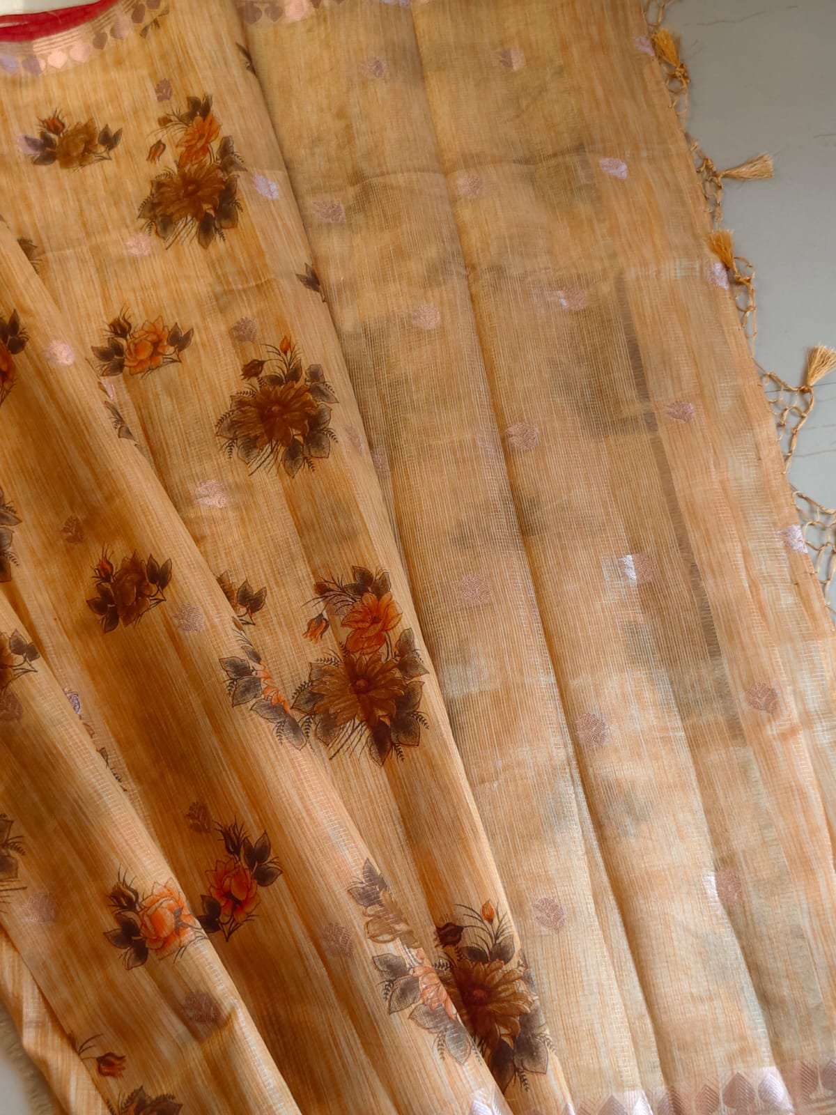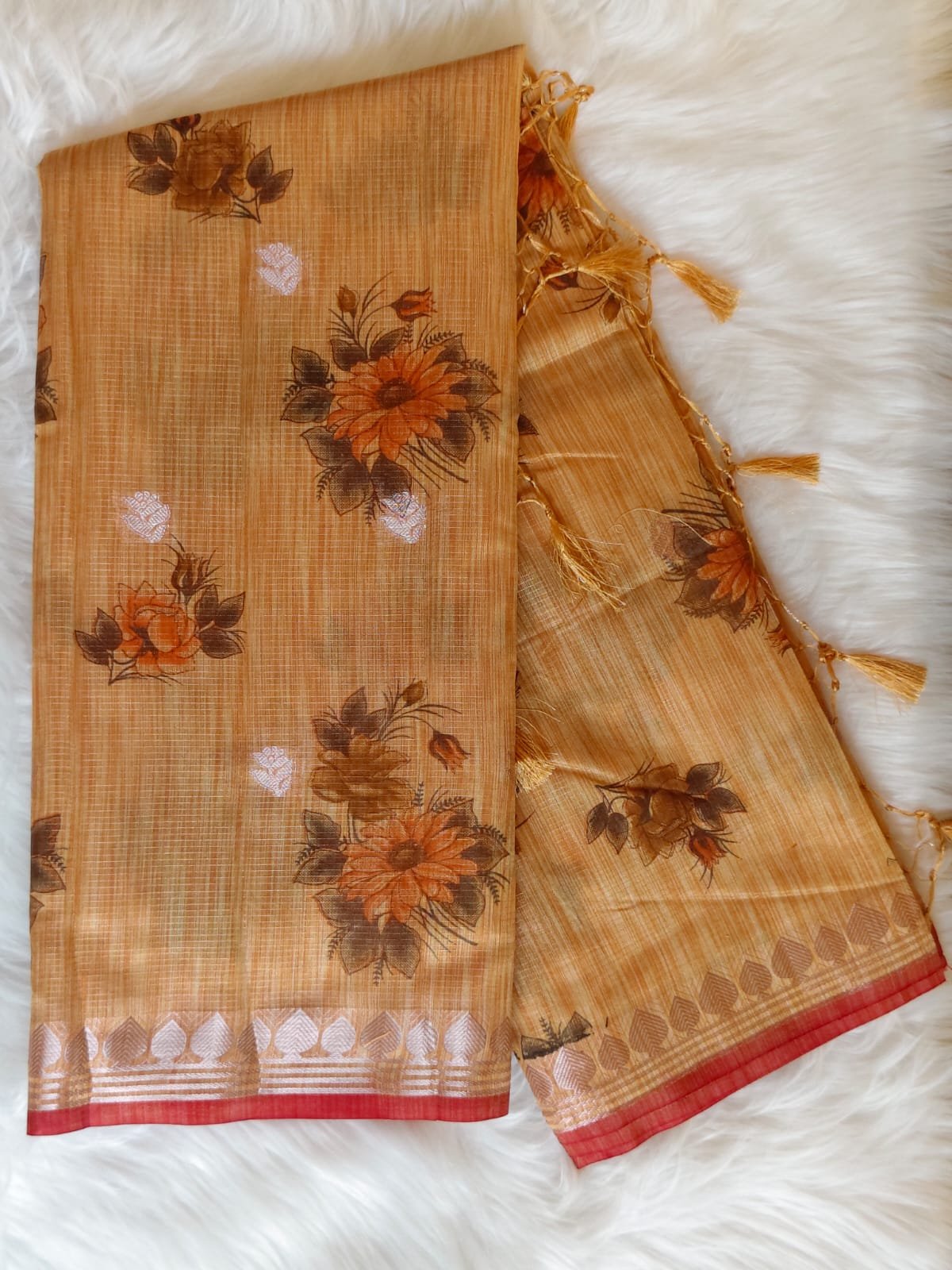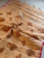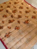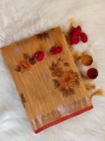 AA1028 Mustard Beige Kota Doria Cotton Silk Saree with Floral Print & Zari Border