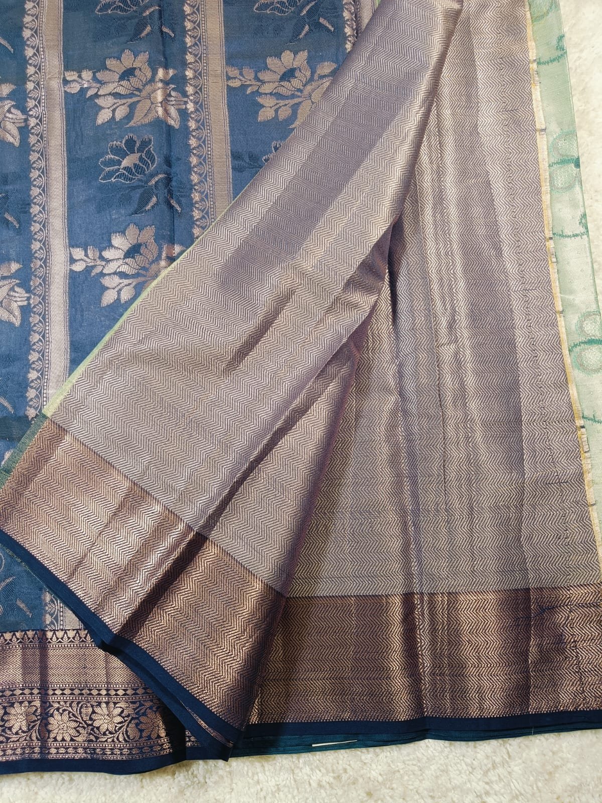 • Border: Copper-gold zari with traditional Banarasi floral and geometric patterns