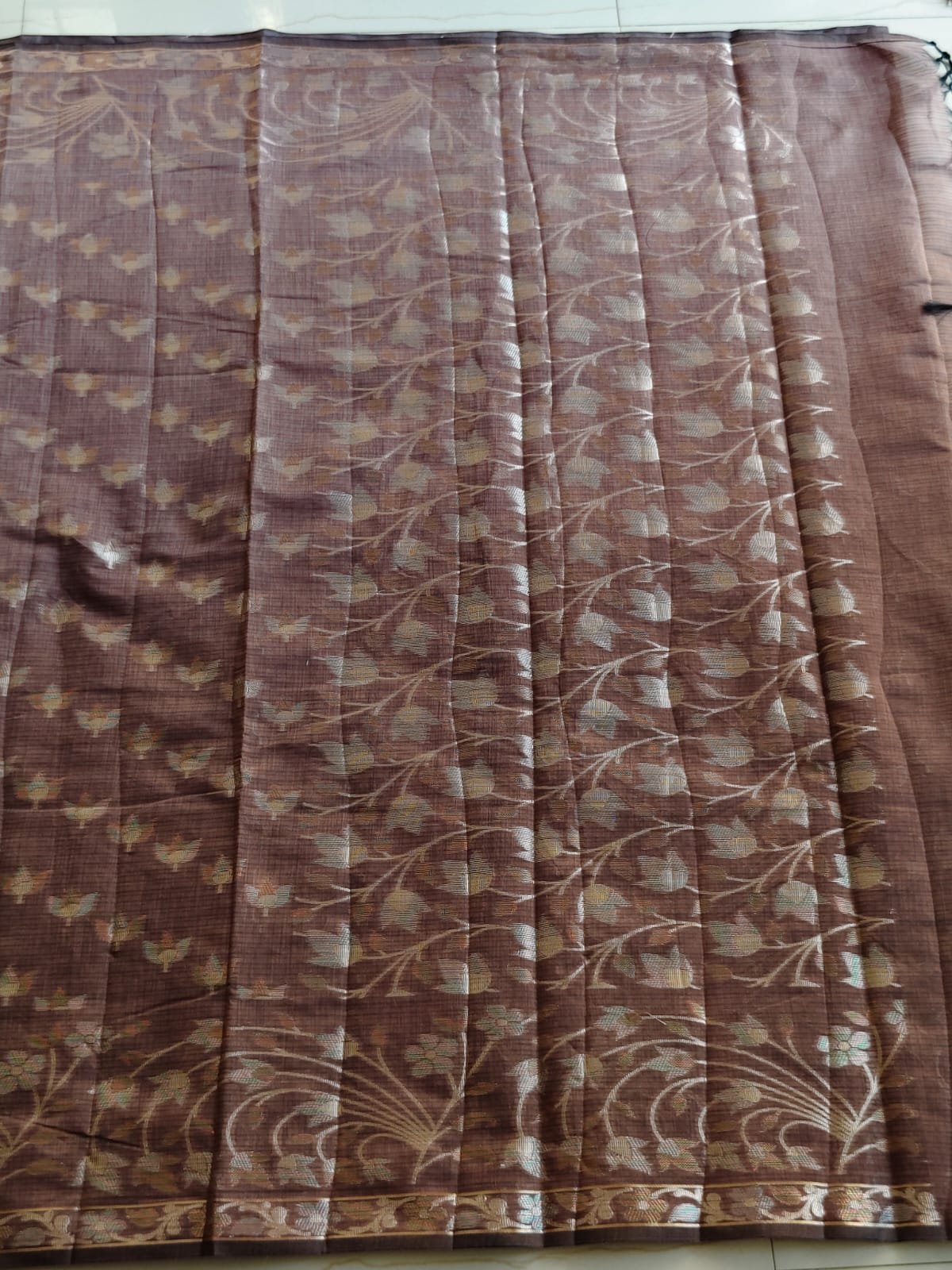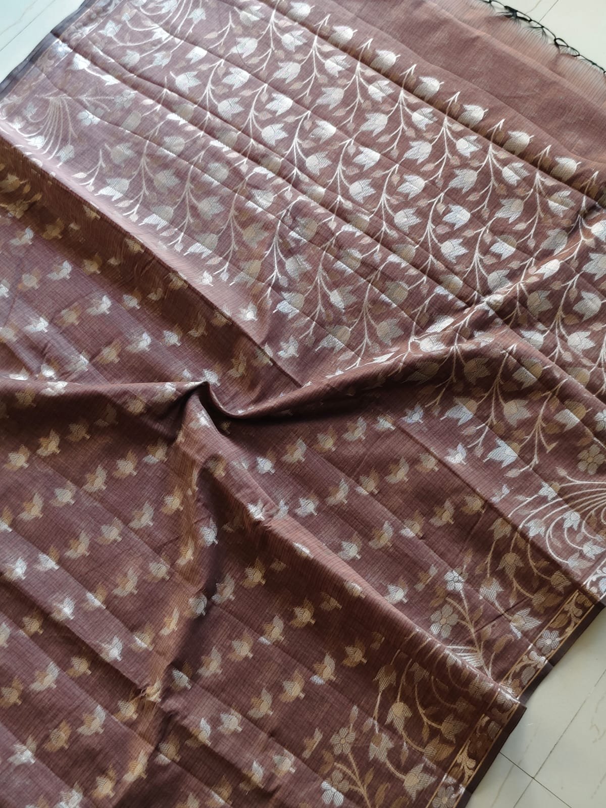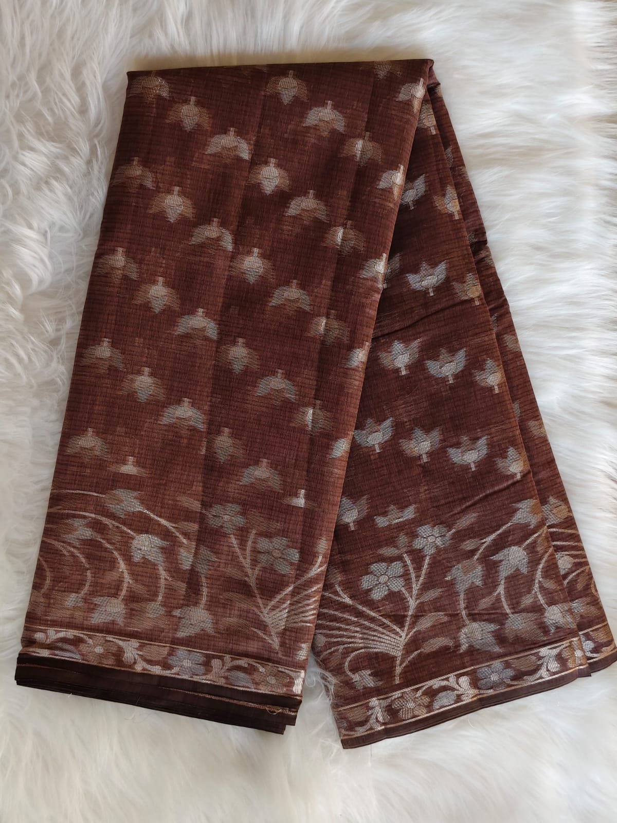 Add a touch of earthy elegance to your wardrobe with this beautiful Coffee Brown Kota Doria saree. Designed with delicate zari woven buti motifs all over, this saree perfectly blends traditional charm with subtle sophistication.