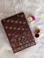 The fine checkered weave of Kota Doria gives a graceful fall and sheer texture, making it extremely comfortable for long hours. The subtle zari detailing enhances the richness of the brown base, creating a classy and timeless look.
