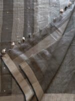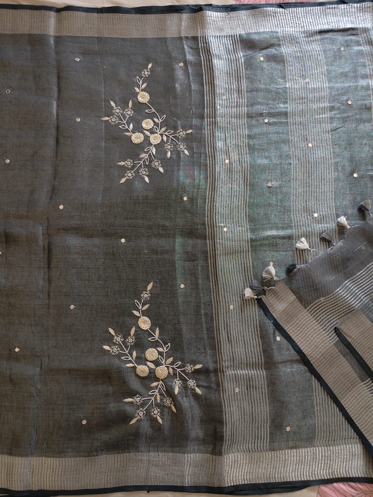 AA1038 Elegant Grey Kota Tissue Saree with Floral Handwork Motifs