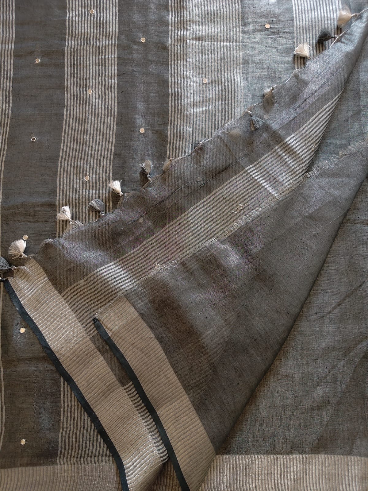 Elevate your ethnic wardrobe with this refined Kota tissue saree in a sophisticated grey tone. Crafted from lightweight and breathable Kota tissue fabric, the saree features delicate embroidered floral vine motifs placed gracefully across the body, complemented by subtle dotted accents. The finely woven striped pallu and border enhance its classic appeal, while tassel detailing adds a stylish finishing touch. With its soft sheen and airy drape, this saree is perfect for festive gatherings, cultural events, or elegant daytime wear.