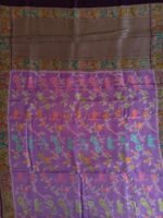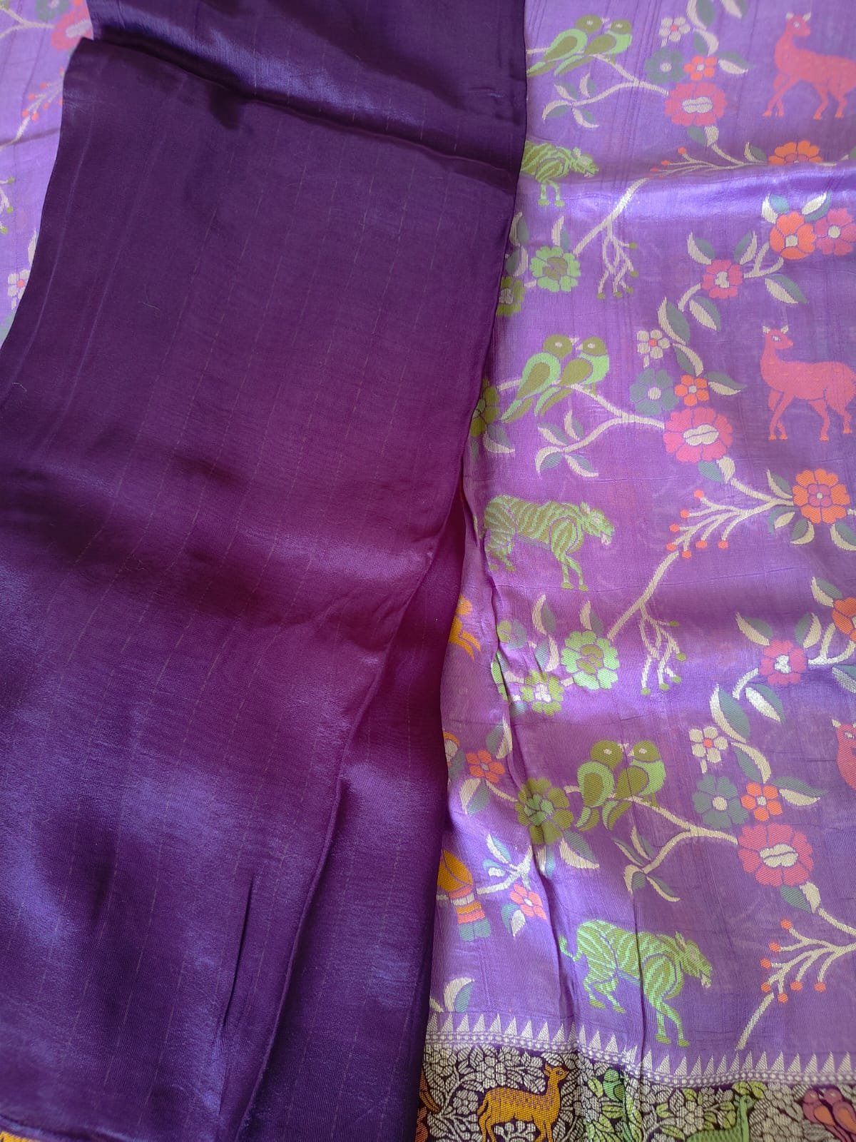 This elegant Banarasi Art Saree showcases a rich purple base beautifully adorned with vibrant multicolour woven motifs inspired by nature and traditional artistry. The body features intricate floral vines intertwined with artistic animal and bird patterns, giving it a heritage and festive appeal. It is complemented by a detailed ornamental border and a contrasting pallu with fine geometric weaving, adding depth and sophistication to the overall look.