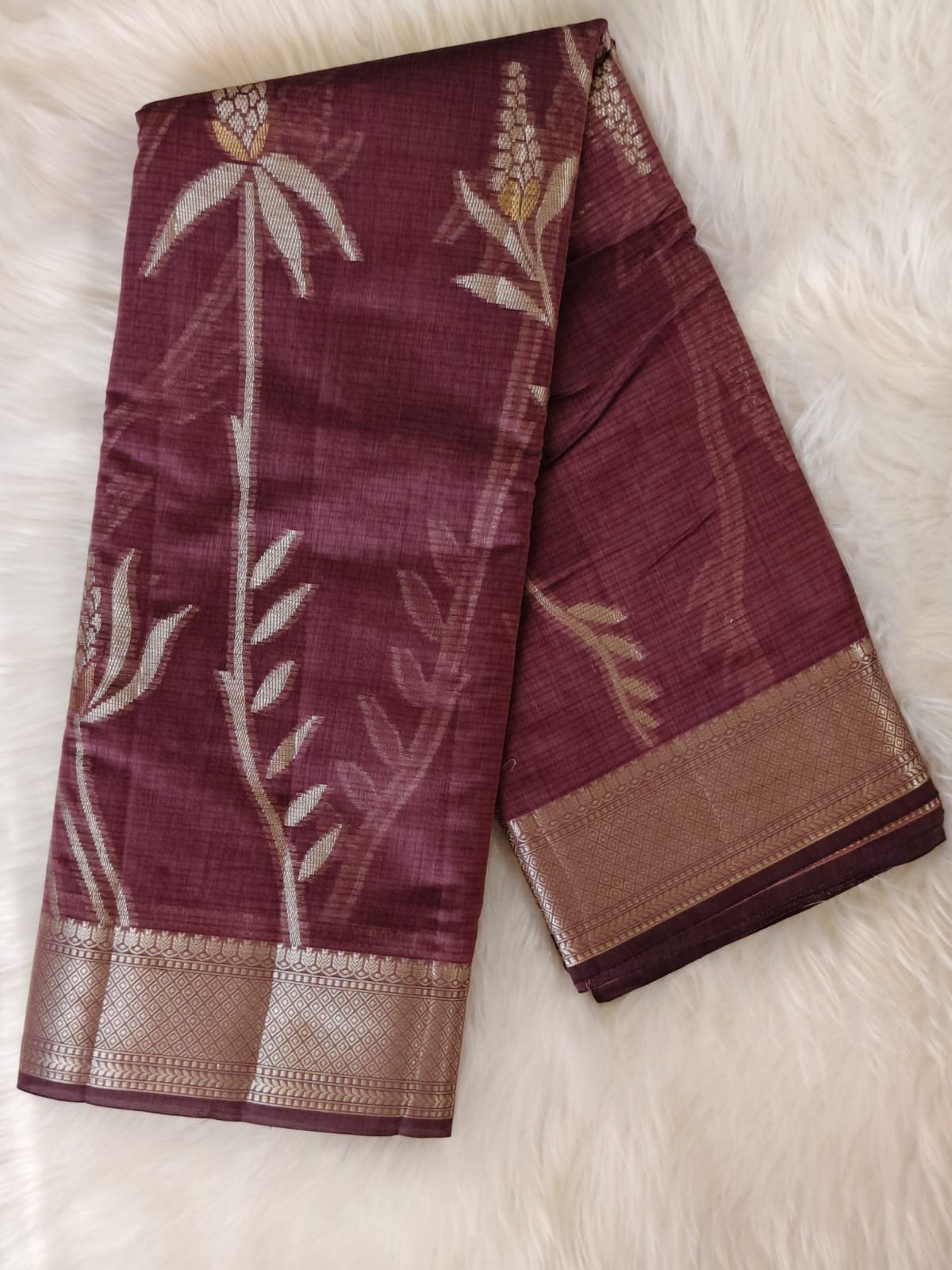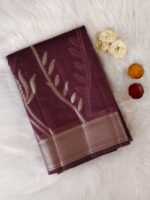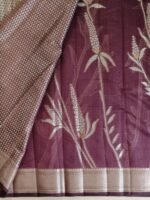 Make a refined style statement with this elegant Kota silk saree, beautifully crafted for women who appreciate subtle luxury. Featuring a rich dark olive / coffee brown base, the saree is adorned with delicate silver zari floral and wheat-inspired motifs, adding a graceful, nature-inspired charm to the drape.