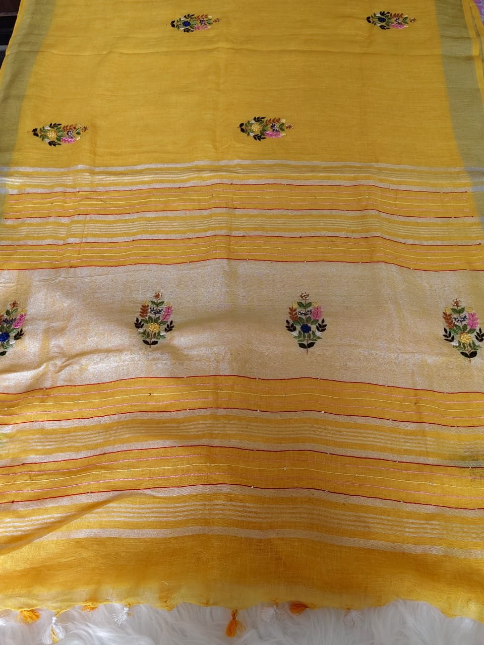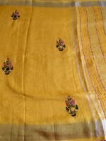 AA120-Pure Linen Mustard Yellow Saree with Exquisite Hand Embroidery and Silver Zari Border