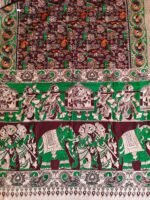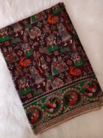 Design: Rich dark maroon base beautifully decorated with multi-colour Kalamkari motifs including traditional figures, animals, florals, peacocks, and temple-inspired artwork