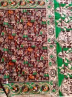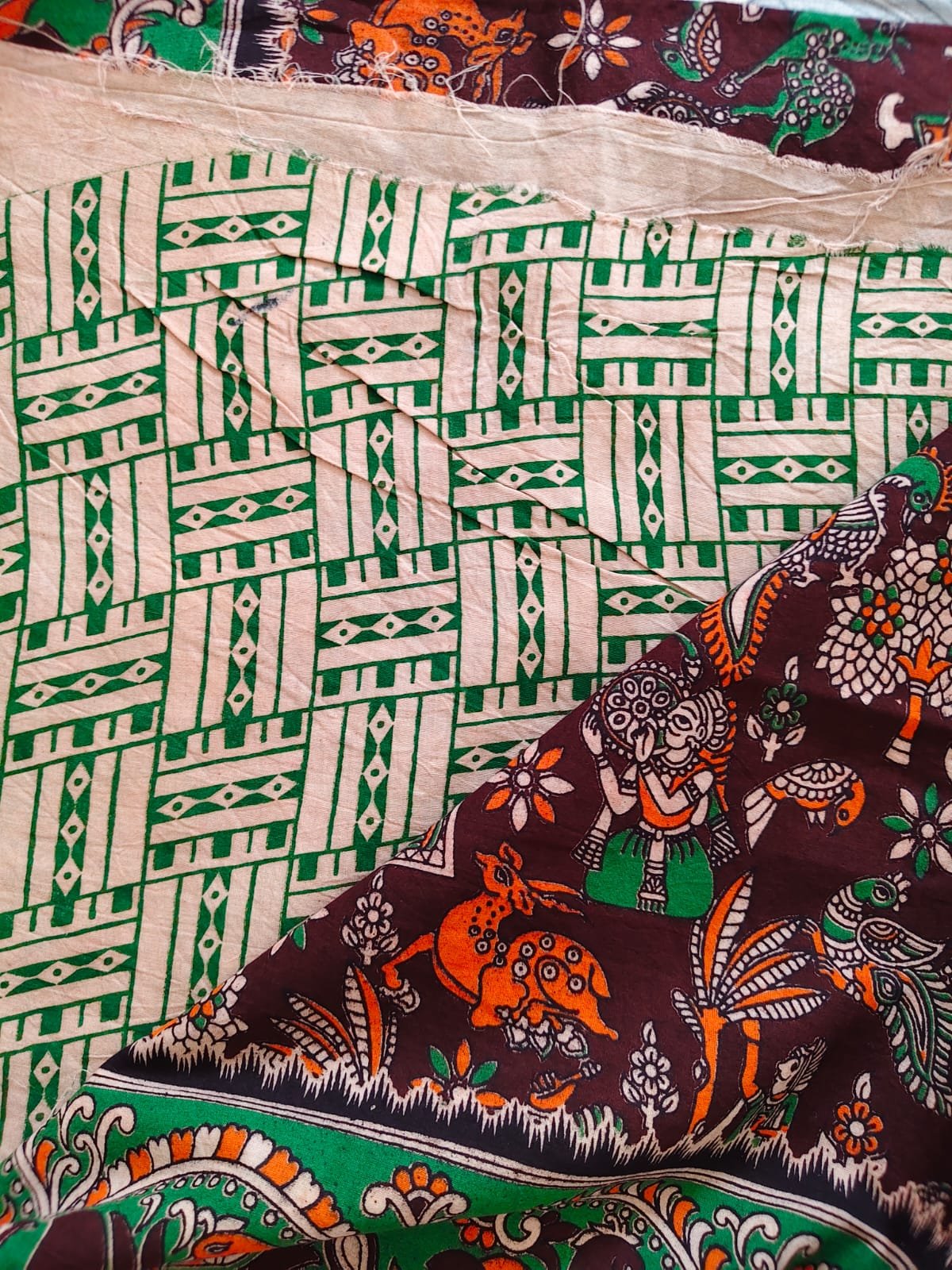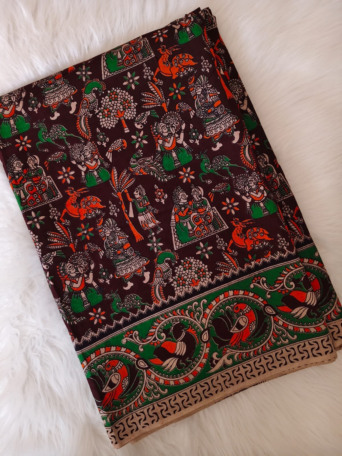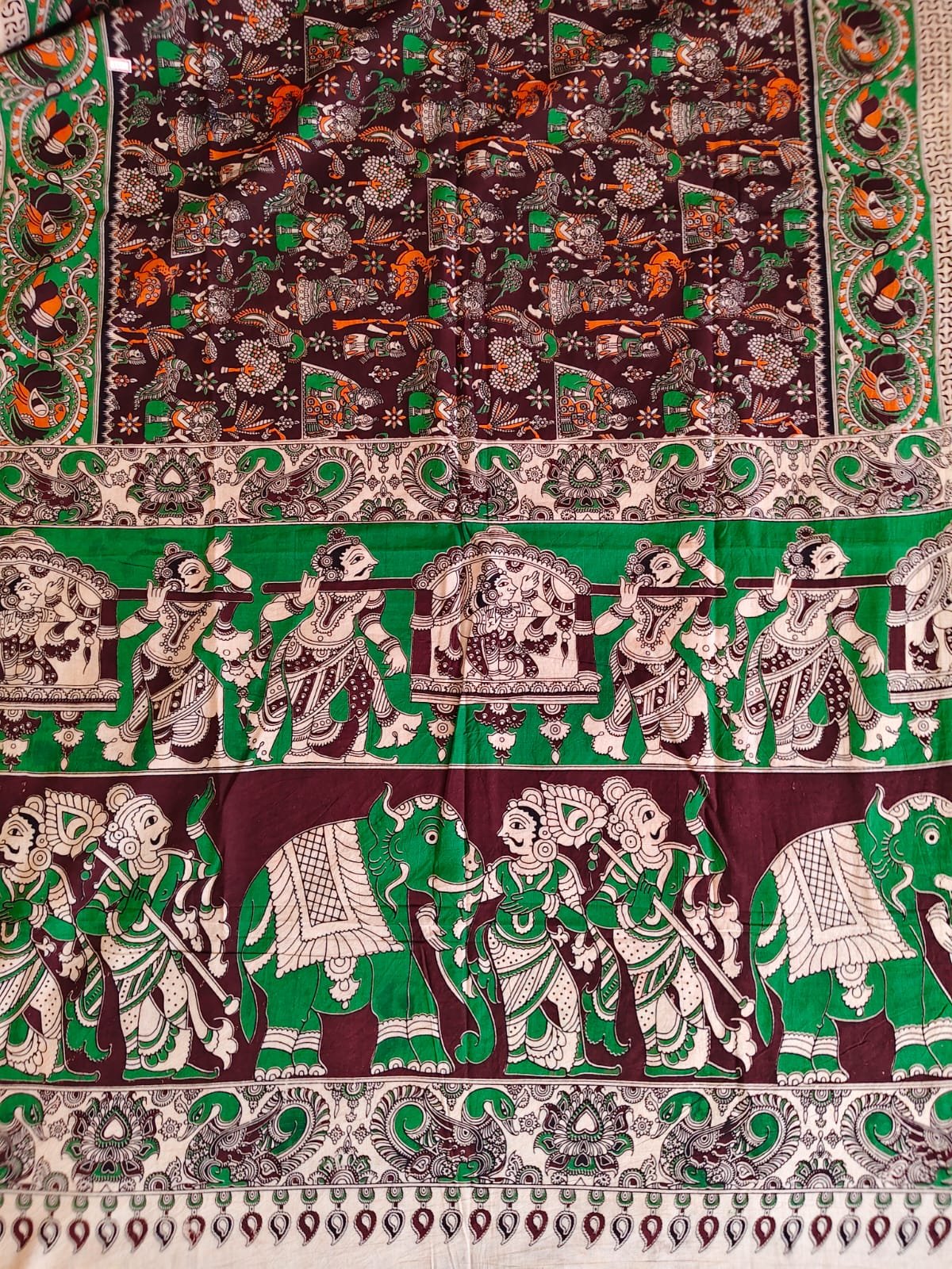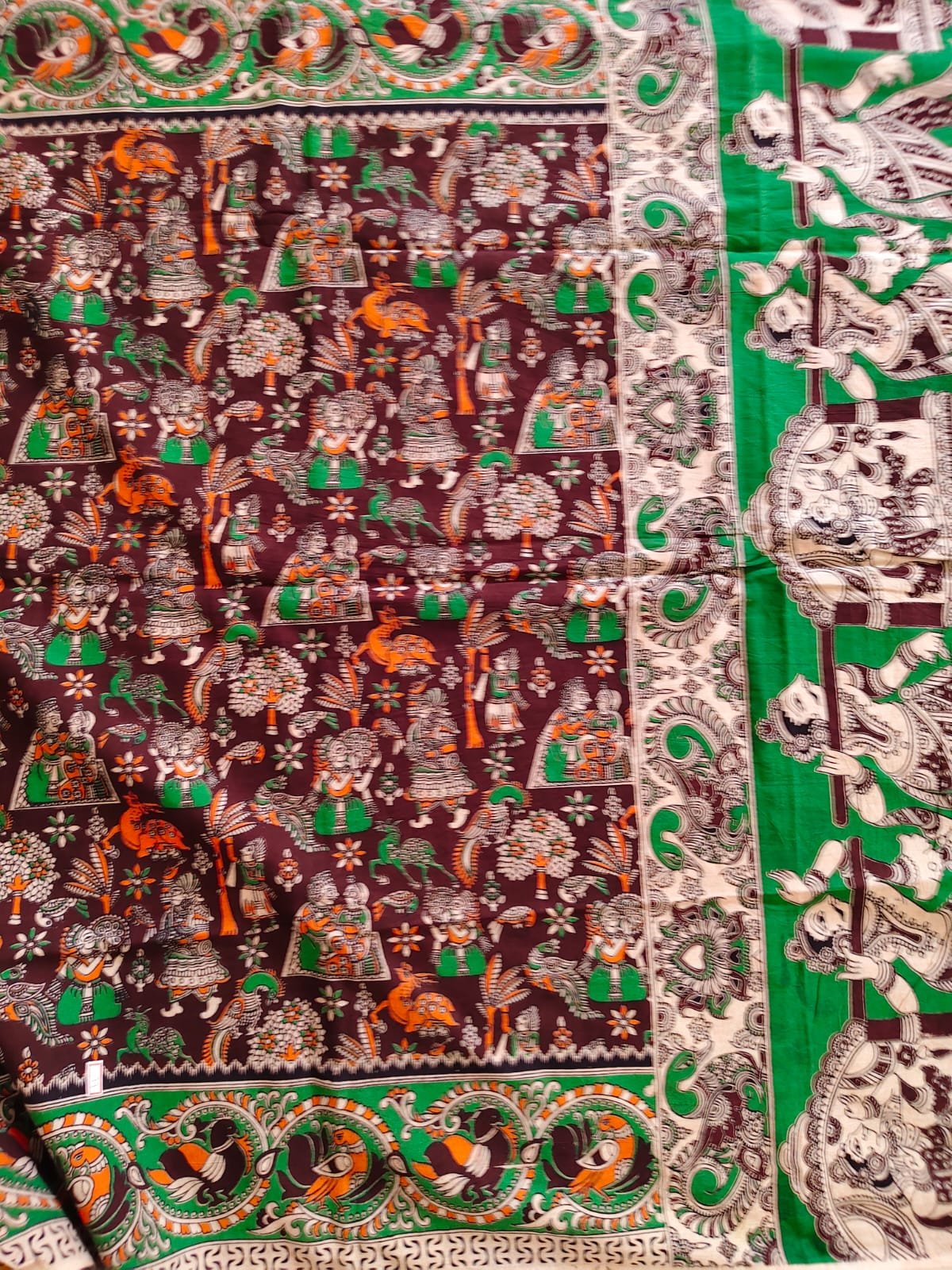 Border: Striking green and orange Kalamkari border with intricate detailing that enhances the ethnic appeal