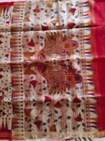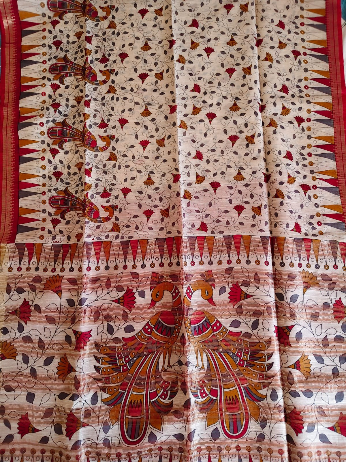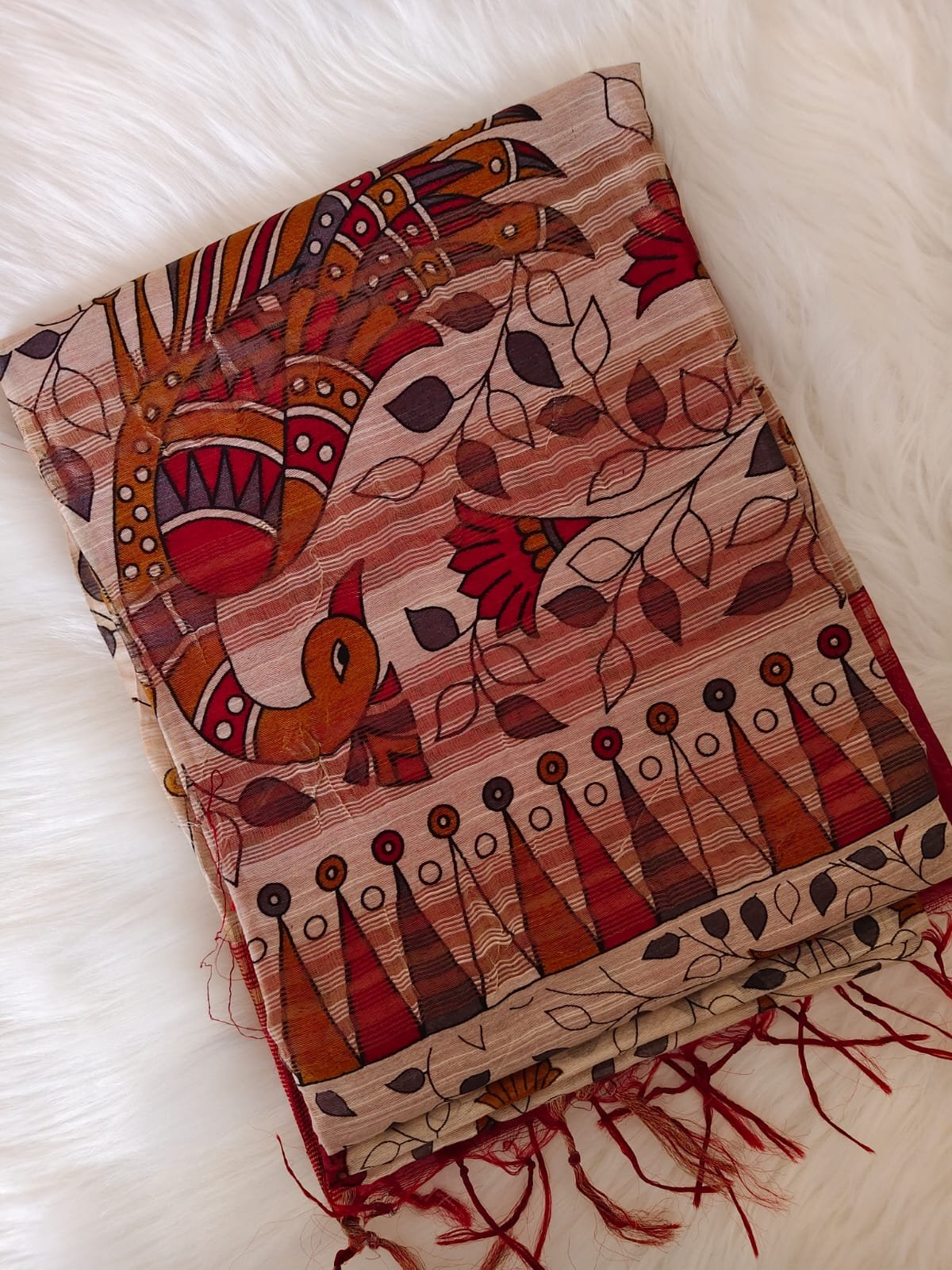 Discover timeless elegance with our Chanderi Silk Kalamkari Saree, a stunning fusion of traditional artistry and luxurious craftsmanship. This saree features beautifully illustrated twin peacock motifs, symbolizing grace and prosperity, complemented by an intricate all-over floral Kalamkari pattern.