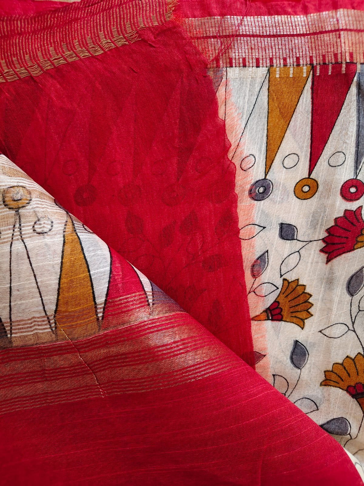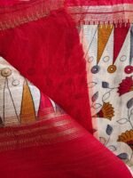 Crafted on soft and lustrous Chanderi silk, the saree showcases a refined palette of rust, maroon, mustard, and earthy neutrals, creating a rich and sophisticated aesthetic. The vibrant geometric border in red and mustard enhances the saree’s traditional charm while ensuring a striking drape.