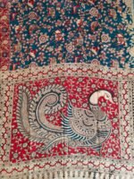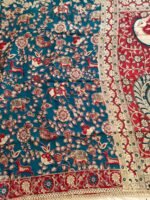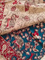 Set against an elegant teal backdrop, the intricate Kalamkari patterns in maroon, beige, and ivory tones add a regal charm, making this saree a statement piece for any festive or special occasion. The saree is completed with a traditional maroon floral border, enhancing its ethnic appeal.