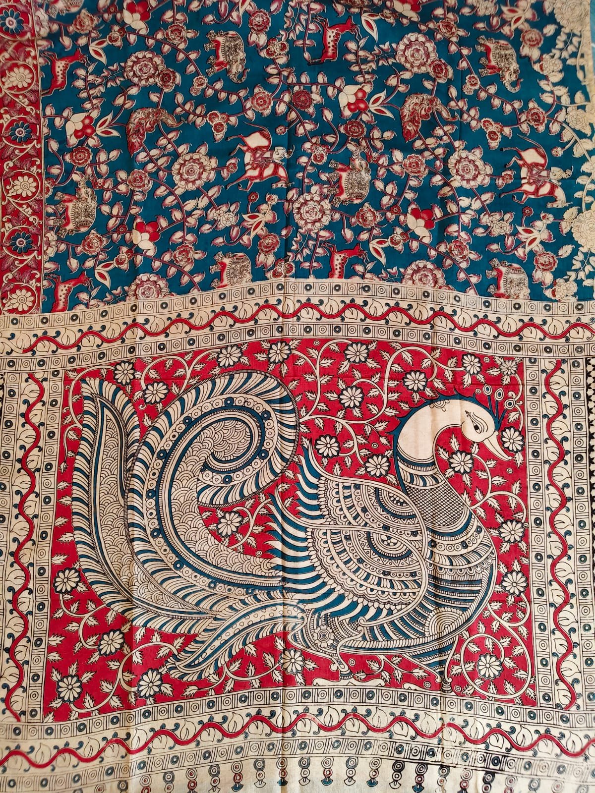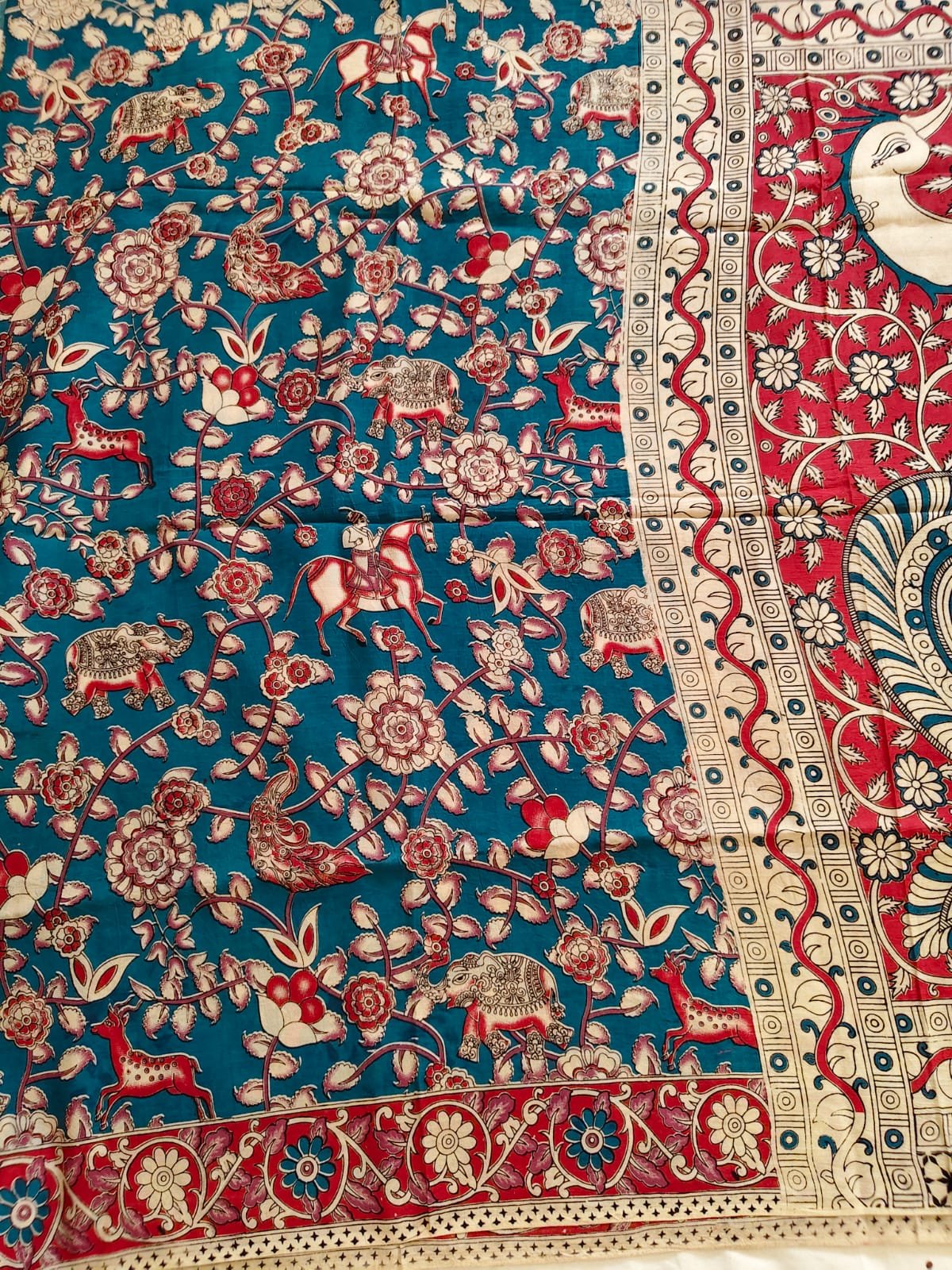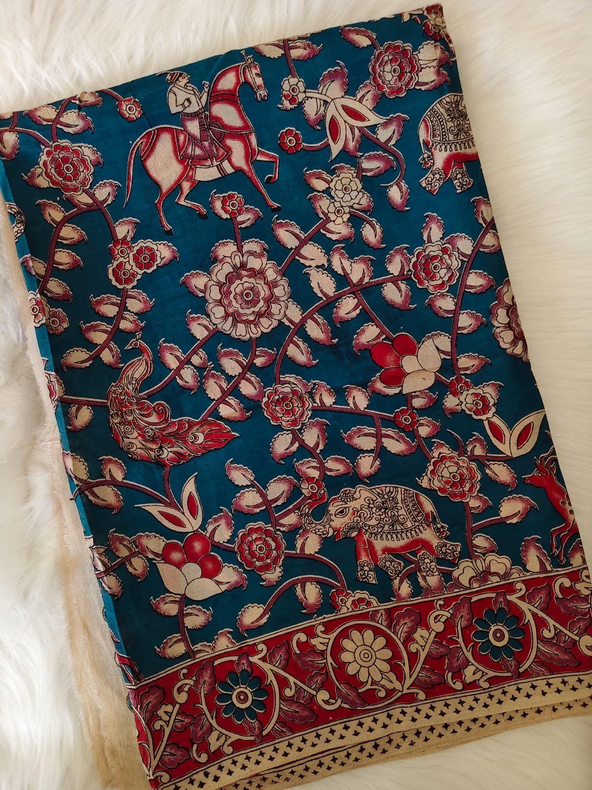 Design: Kalamkari print with royal procession motifs (horse rider, elephant, deer, peacock)