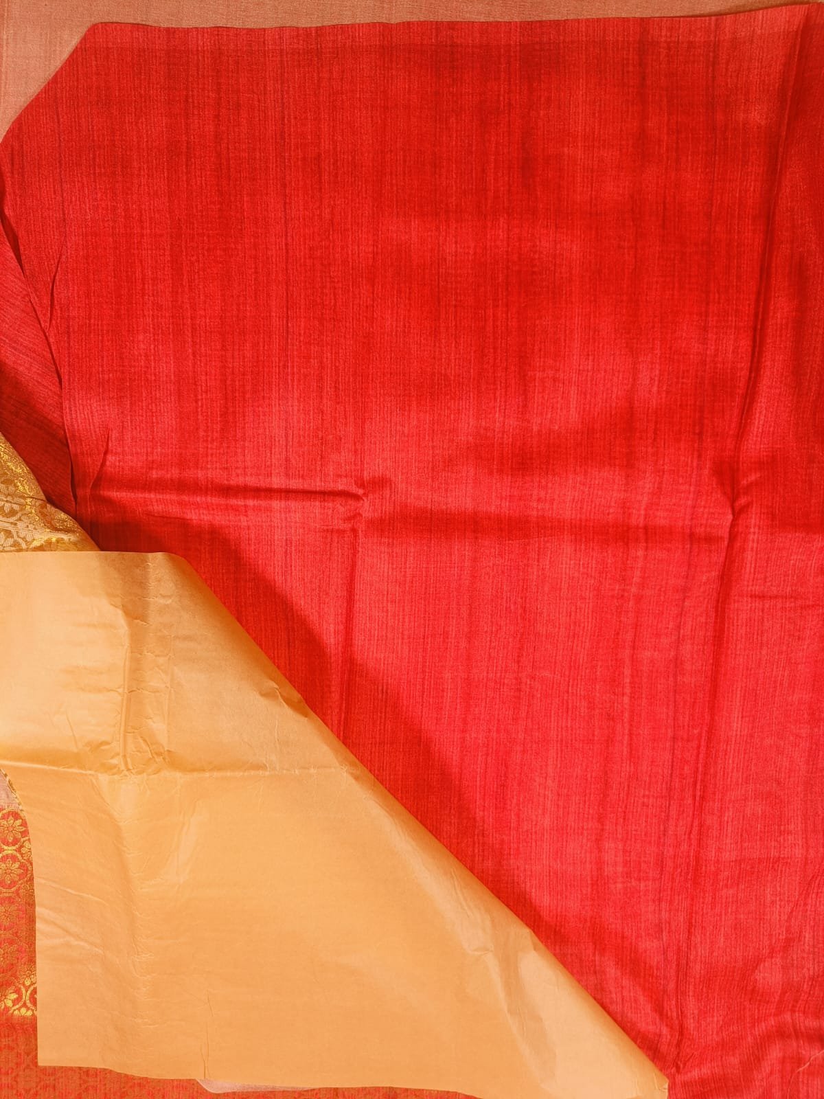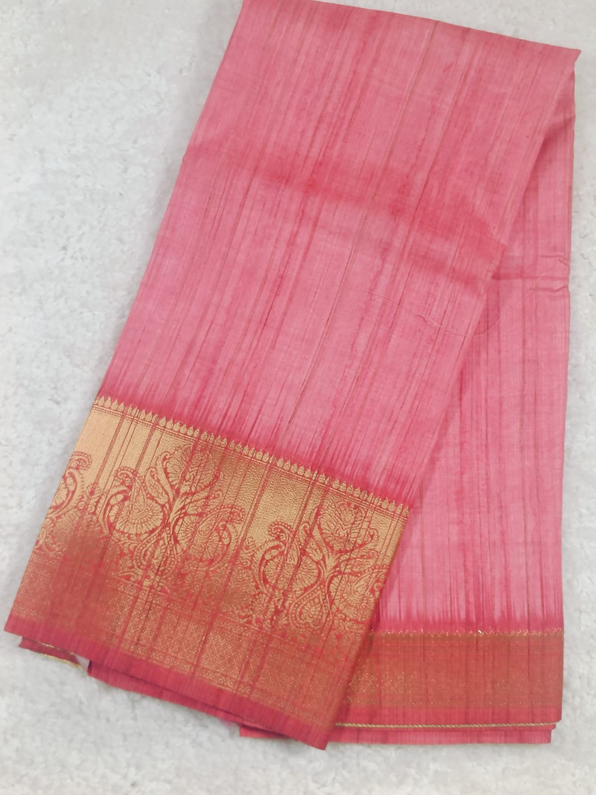 Soft Pink and Gold Zari Fancy saree. The body of the fabric is a lovely shade of pink and features striation texture running vertically, giving it a raw, organic look. The color transitions subtly across the width of the fabric.