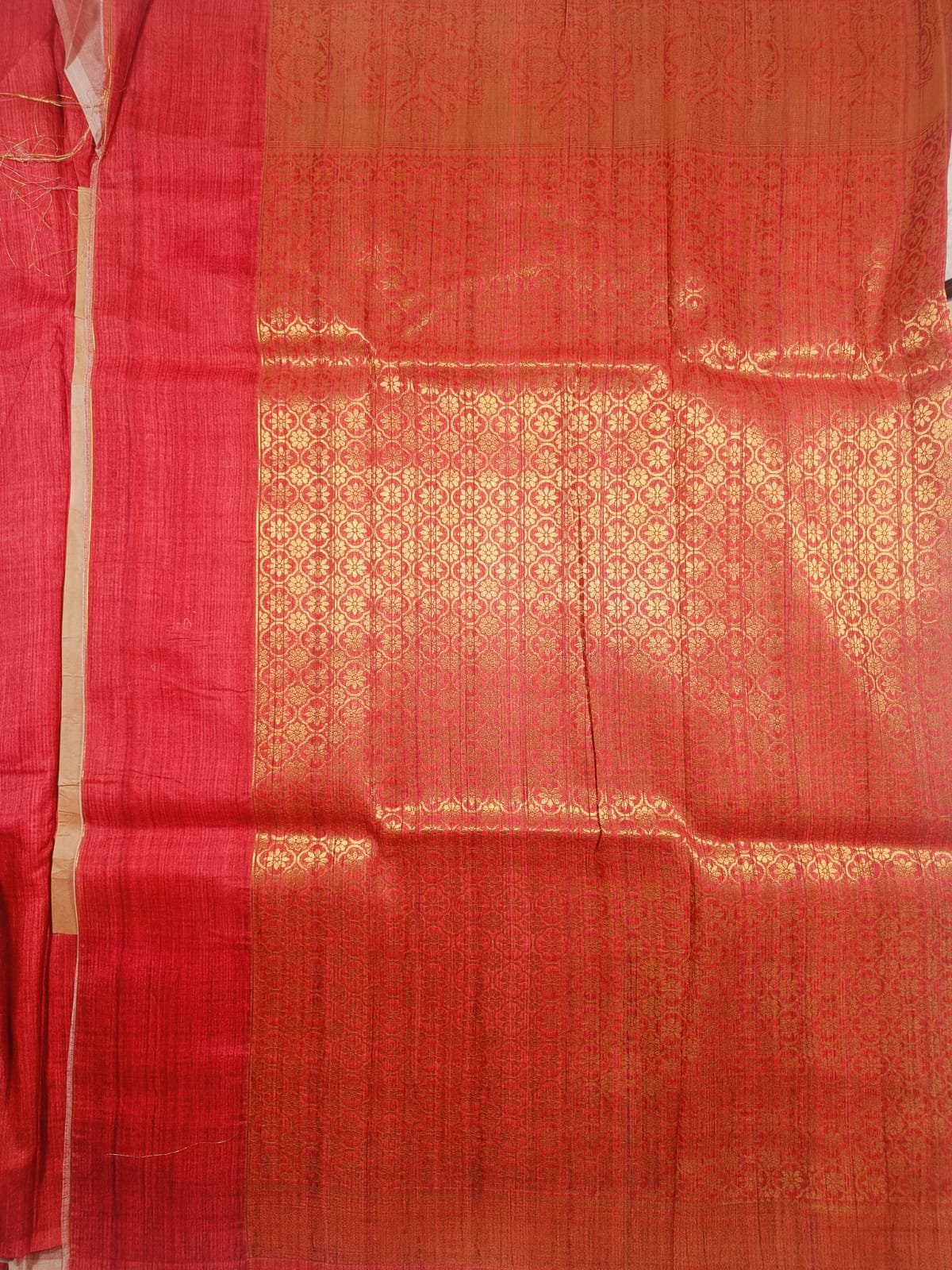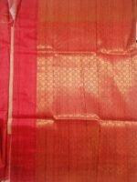 The saree has a prominent broad in a rich orange-red tone, heavily woven with gold Zari. The design along the top edge of the border features traditional motifs, specifically paisley or mango designs, woven in the contrasting pink/red color over the gold background.