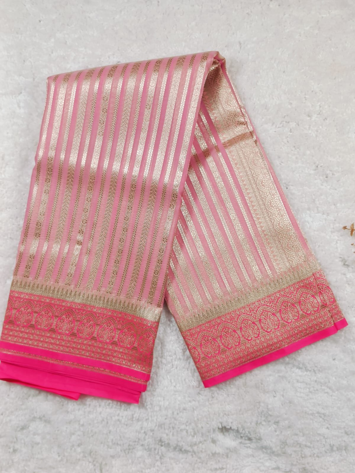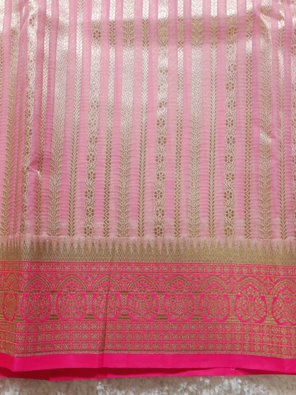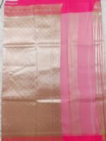 The pallu is the heaviest section of the Saree. It is entirely covered in dense Gold Zari Broca4+2e weaving. The pattern features a detailed, repeating diamond lattice or geometric trellis design, giving it a rich, traditional appearance. It features a broad band of rich gold zari weaving, adorned with intricate traditional motifs, possibly half-circles or stylized paisley elements. The entire piece is grounded by a final, solid edge in the striking Rani Pink shade, providing a bold, contrasting frame.
