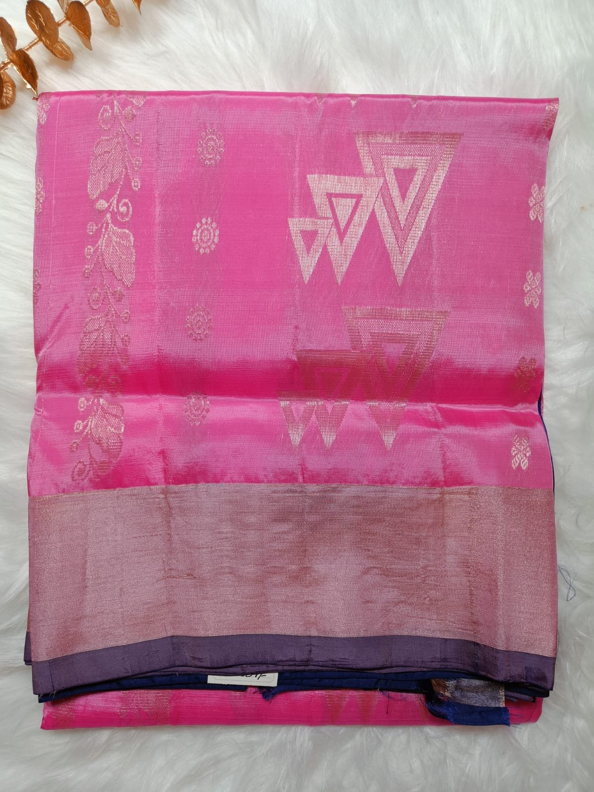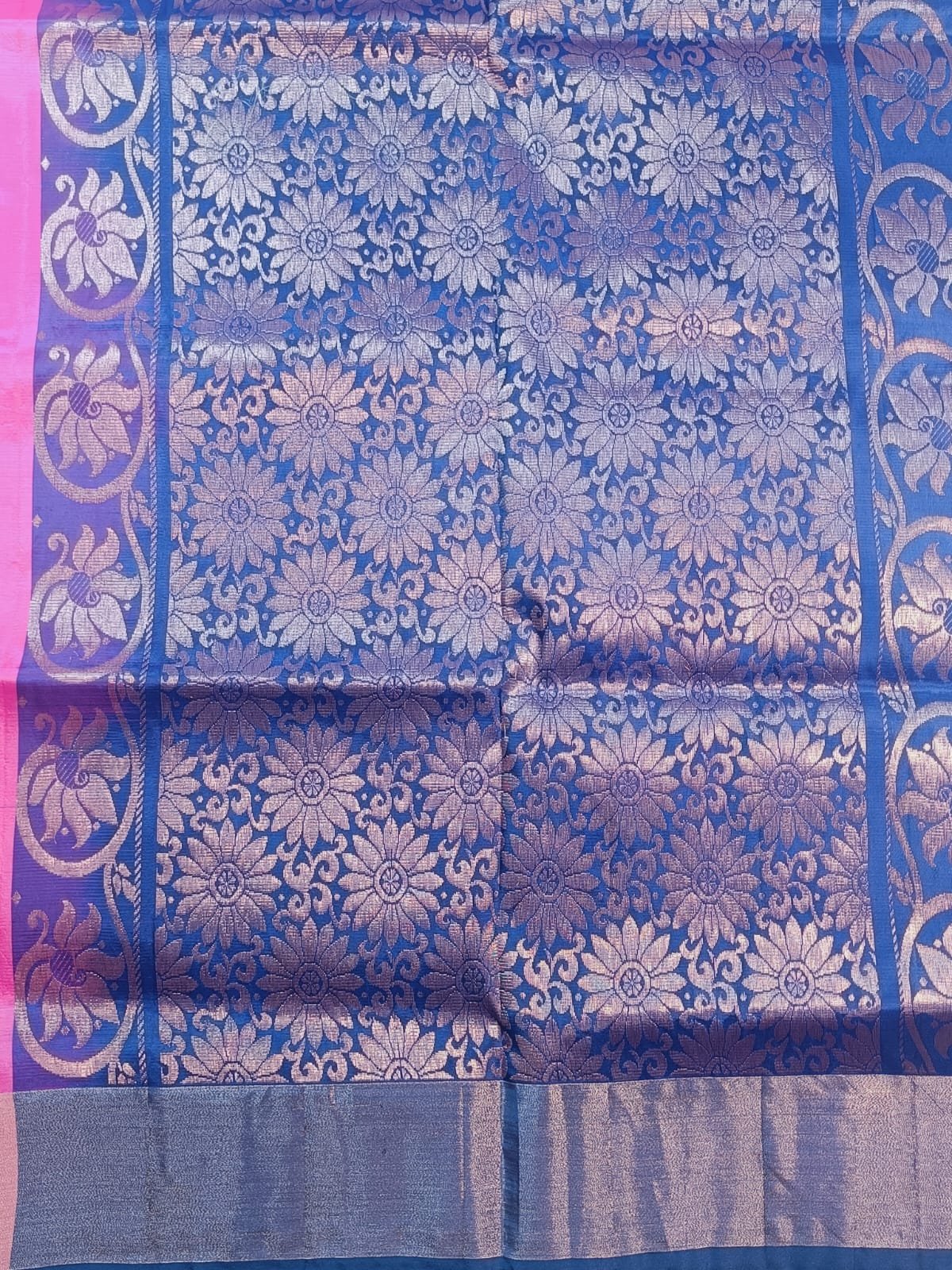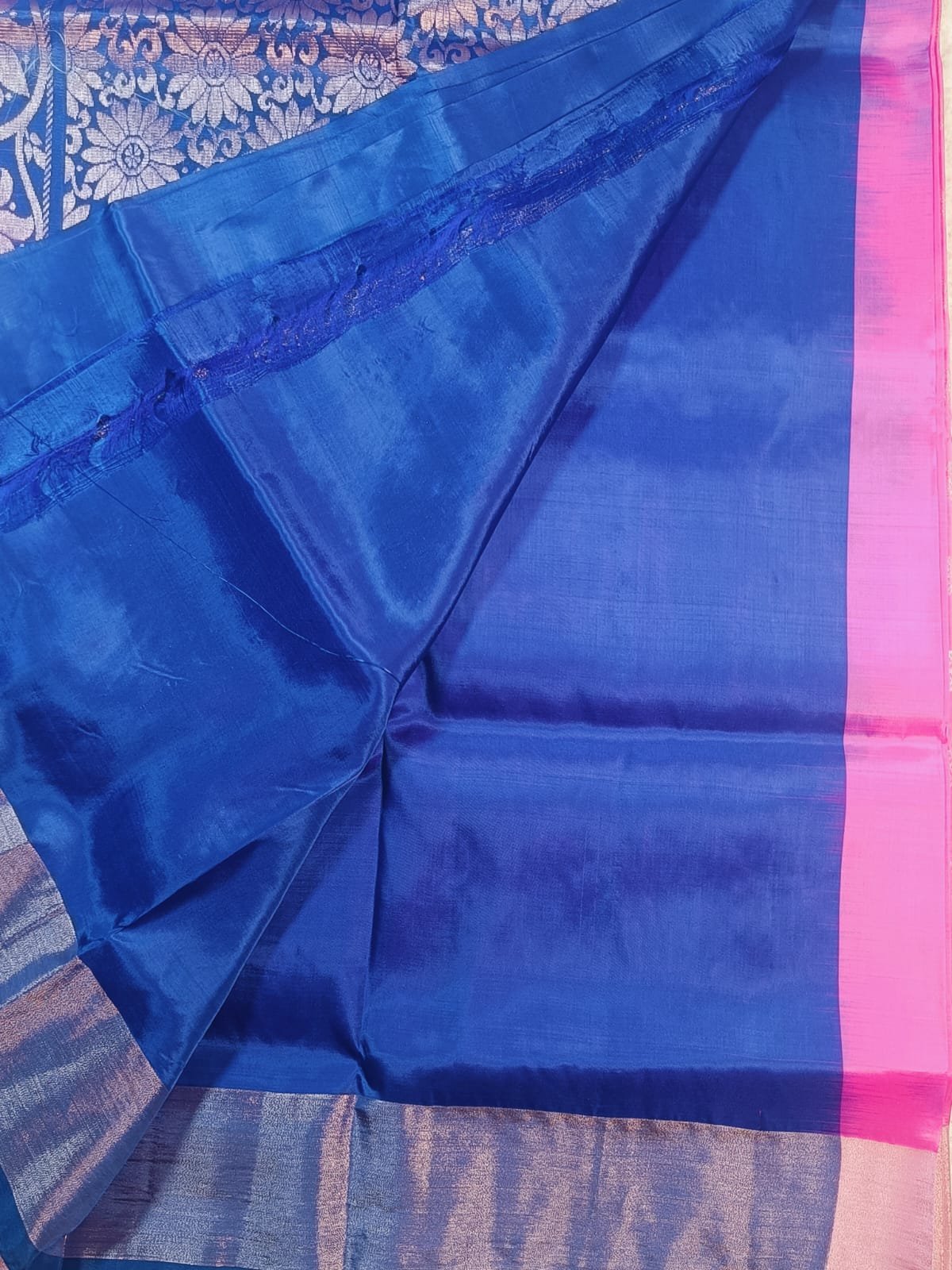 Drape yourself in timeless elegance with this exquisite Uppada Handloom Silk Saree, a perfect blend of traditional artistry and modern charm. The saree features a rich Baby pink color body. beautifully contrasted by a vibrant blue color pallu and golden border.