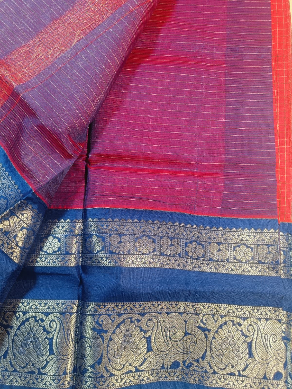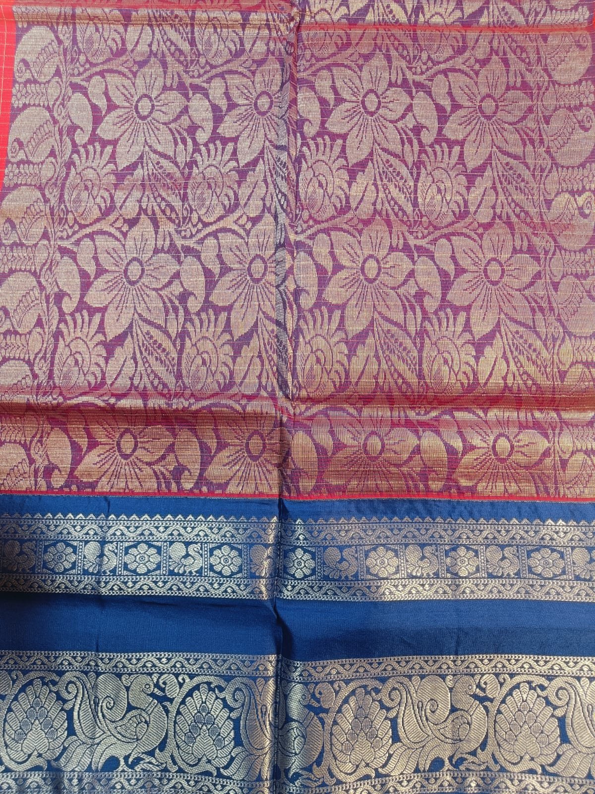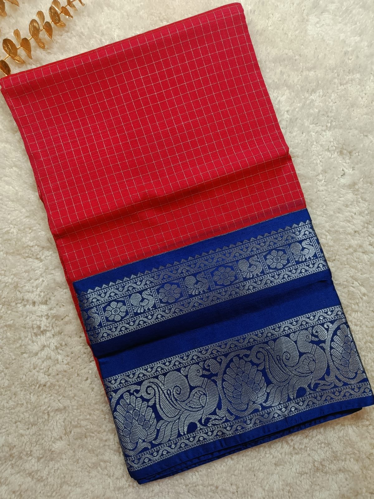 Drape yourself in timeless elegance with this exquisite Mangalagiri Handloom Silk Cotton Saree, a perfect blend of traditional artistry and modern charm. The saree features a rich red color checks body. beautifully contrasted by a vibrant blue pallu and blue border.