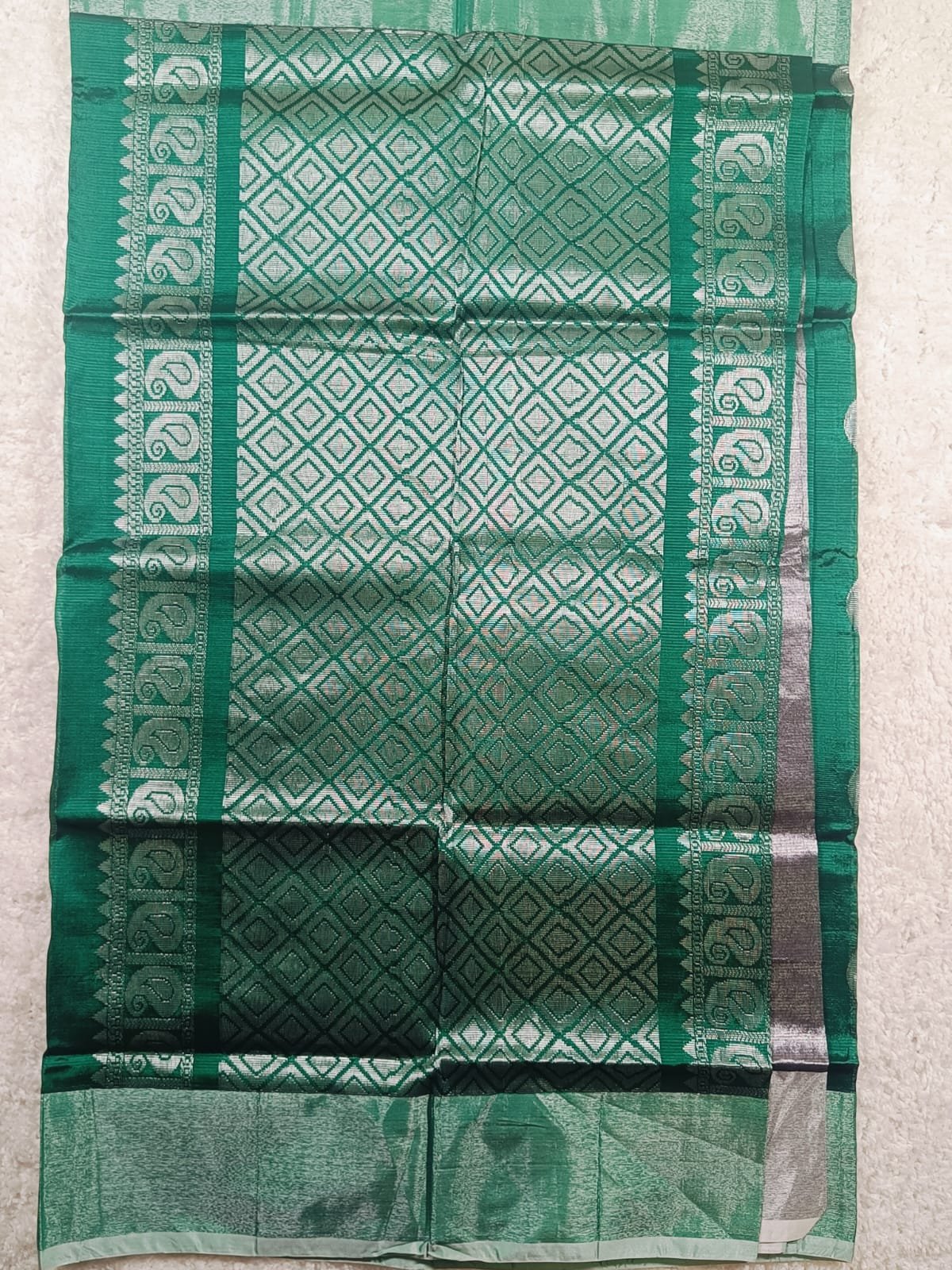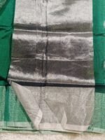 Drape yourself in timeless elegance with this exquisite Mangalagiri Handloom Silk Cotton Saree, a perfect blend of traditional artistry and modern charm. The saree features a rich Green color body . beautifully contrasted by a vibrant green pallu and silver border.