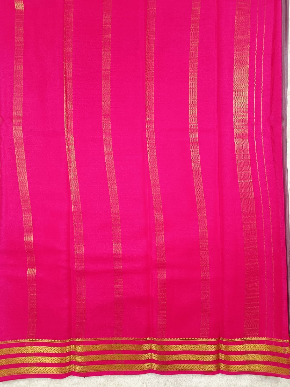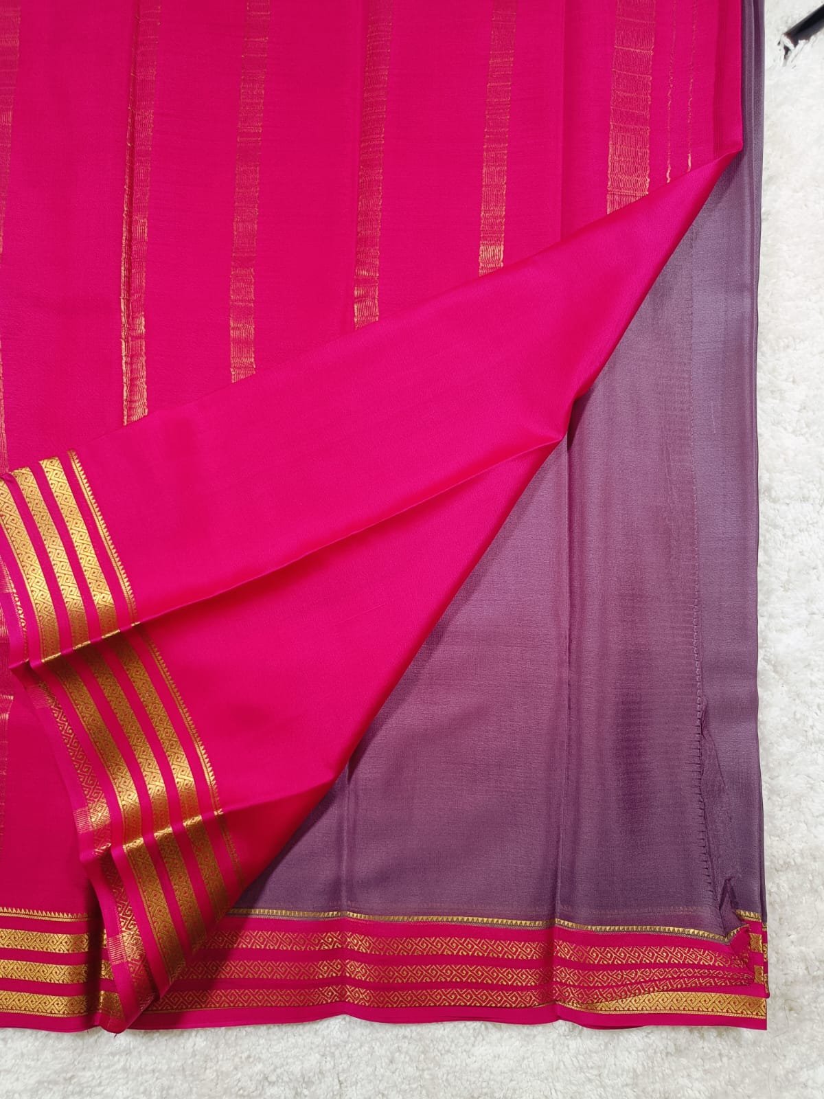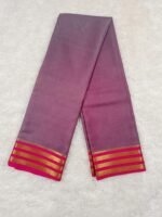 Drape yourself in timeless elegance with this Pure Mysore Silk Saree, beautifully crafted in a graceful dual-tone lavender and pink combination. The saree features a lustrous finish with a vibrant hot pink pallu adorned with delicate gold zari stripes, showcasing the royal heritage of Mysore silk weaving.