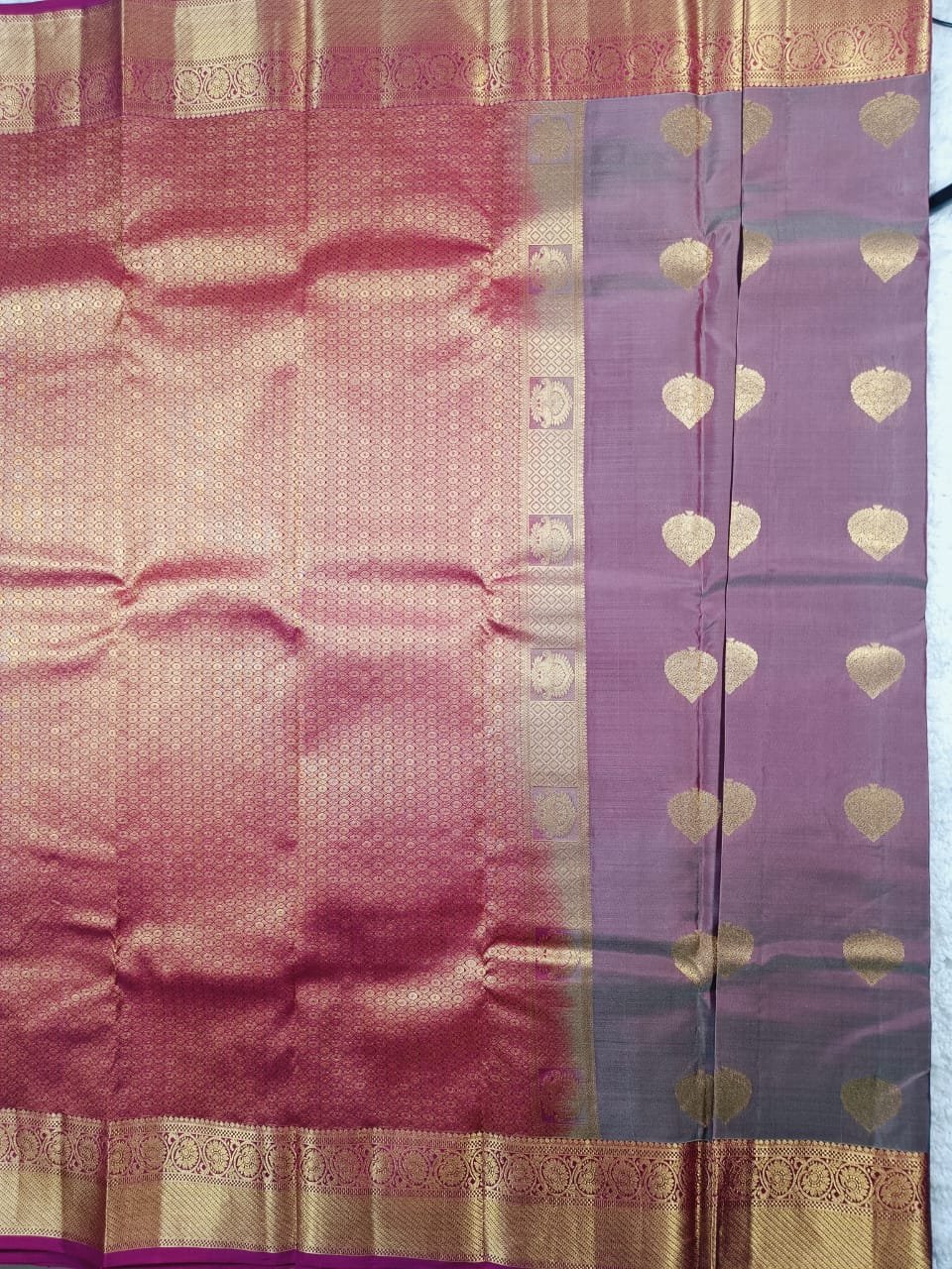 The saree features intricate golden leaf motifs woven throughout the body, complemented by a rich gold zari border with intricate patterns that exude luxury. The contrasting magenta pink pallu adds a vibrant touch, making it perfect for festive occasions, weddings, and celebrations.