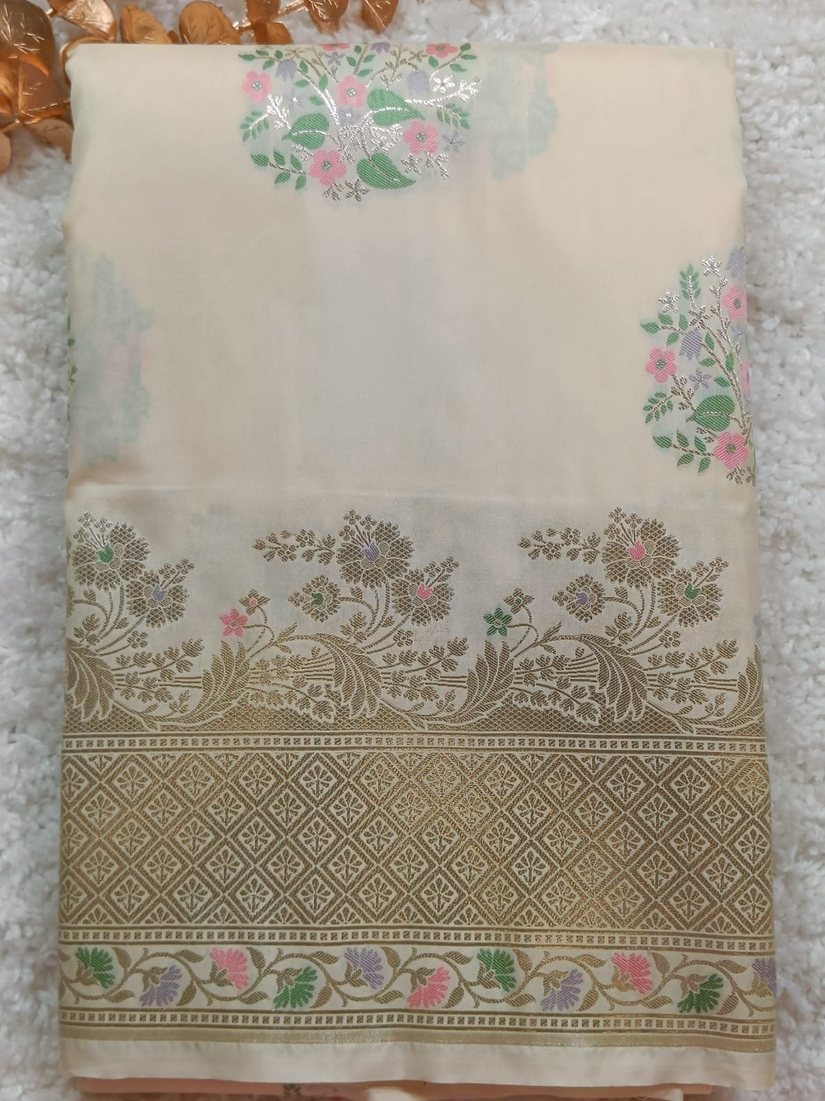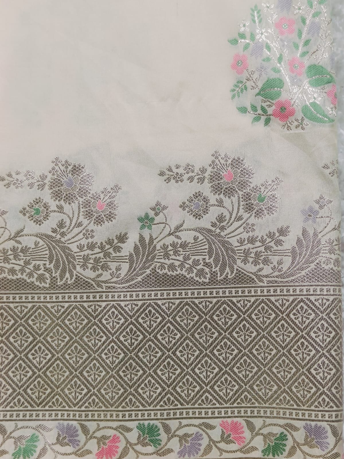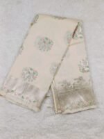 Indulge in timeless elegance with this Banaras Premium Katan Tilfi Silk Saree, a masterpiece that reflects the grandeur of traditional Banarasi craftsmanship. Woven meticulously with fine silk threads, this saree features an exquisite Elegant Ivory with Pastel Floral Zari Weave silver zari tilfi border and pallu, adorned with delicate pastel floral motifs in shades of pink, green, and lilac — creating a subtle yet luxurious look.