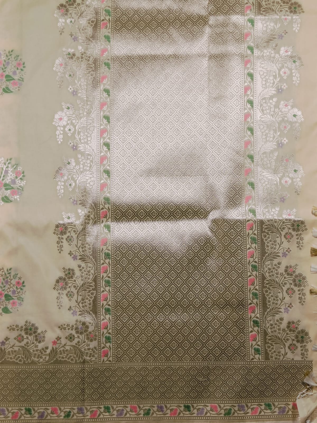 Border & Pallu: Heavy silver zari with geometric and floral weaving