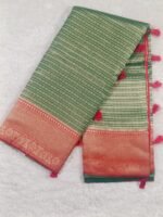 Elevate your ethnic wardrobe with this Banaras Soft Katan Silk Saree, a timeless blend of tradition and elegance. This saree comes in a striking green body adorned with intricate golden zari stripes, beautifully complemented by a rich red border and pallu woven with floral and geometric zari patterns.