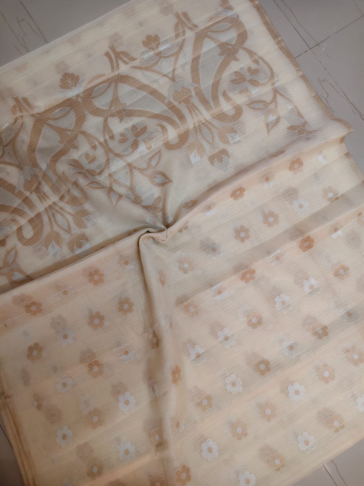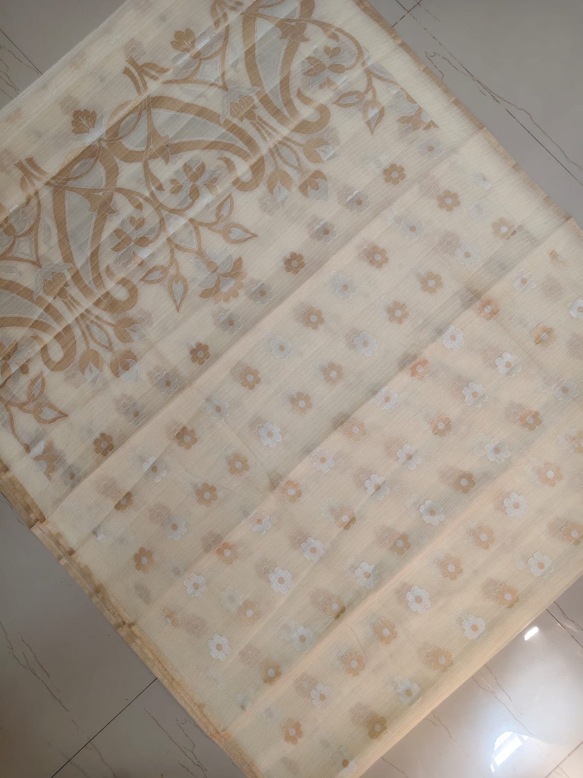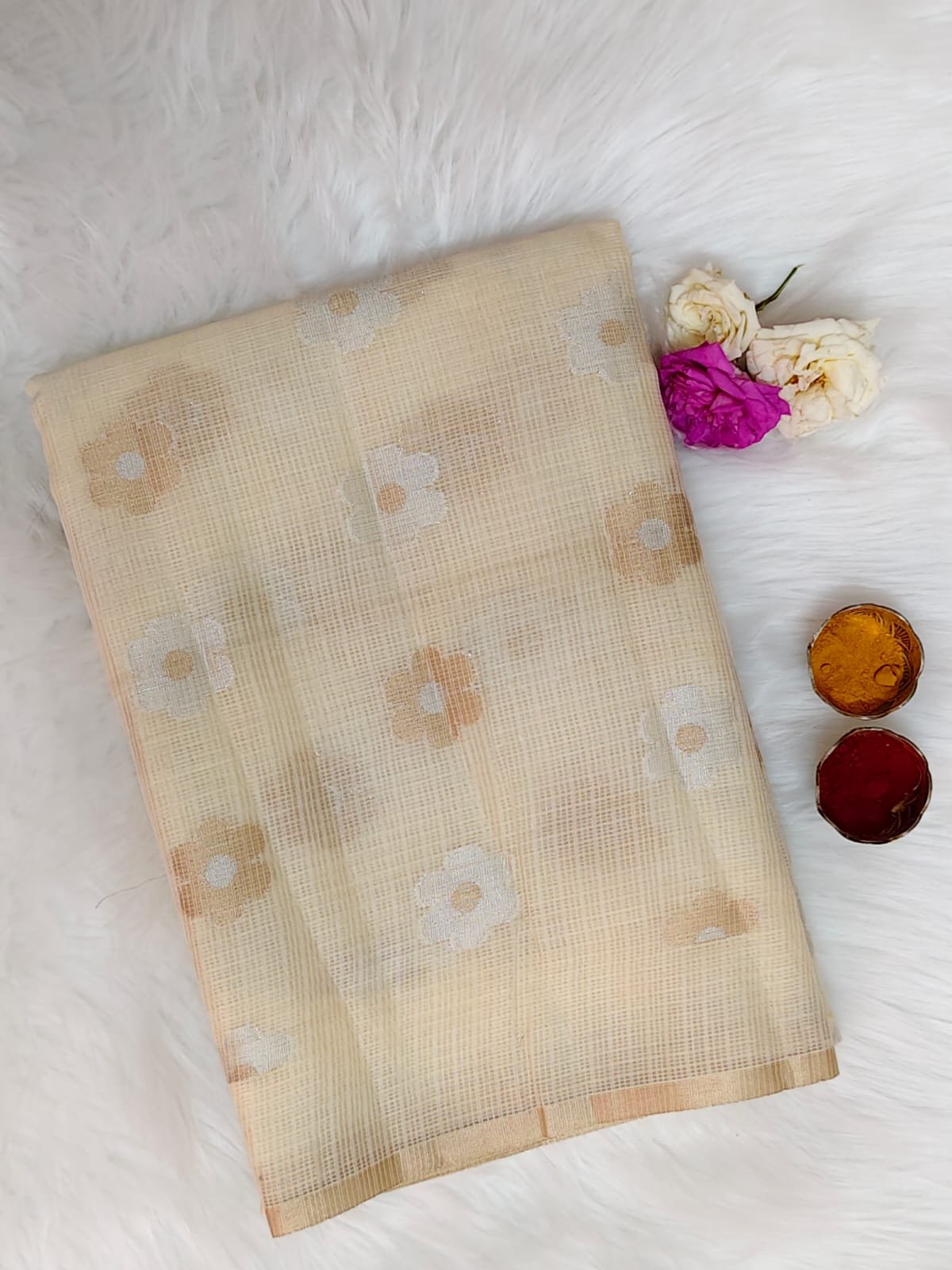 AA102 Cream Kota Silk Saree with Delicate Floral Woven Motifs