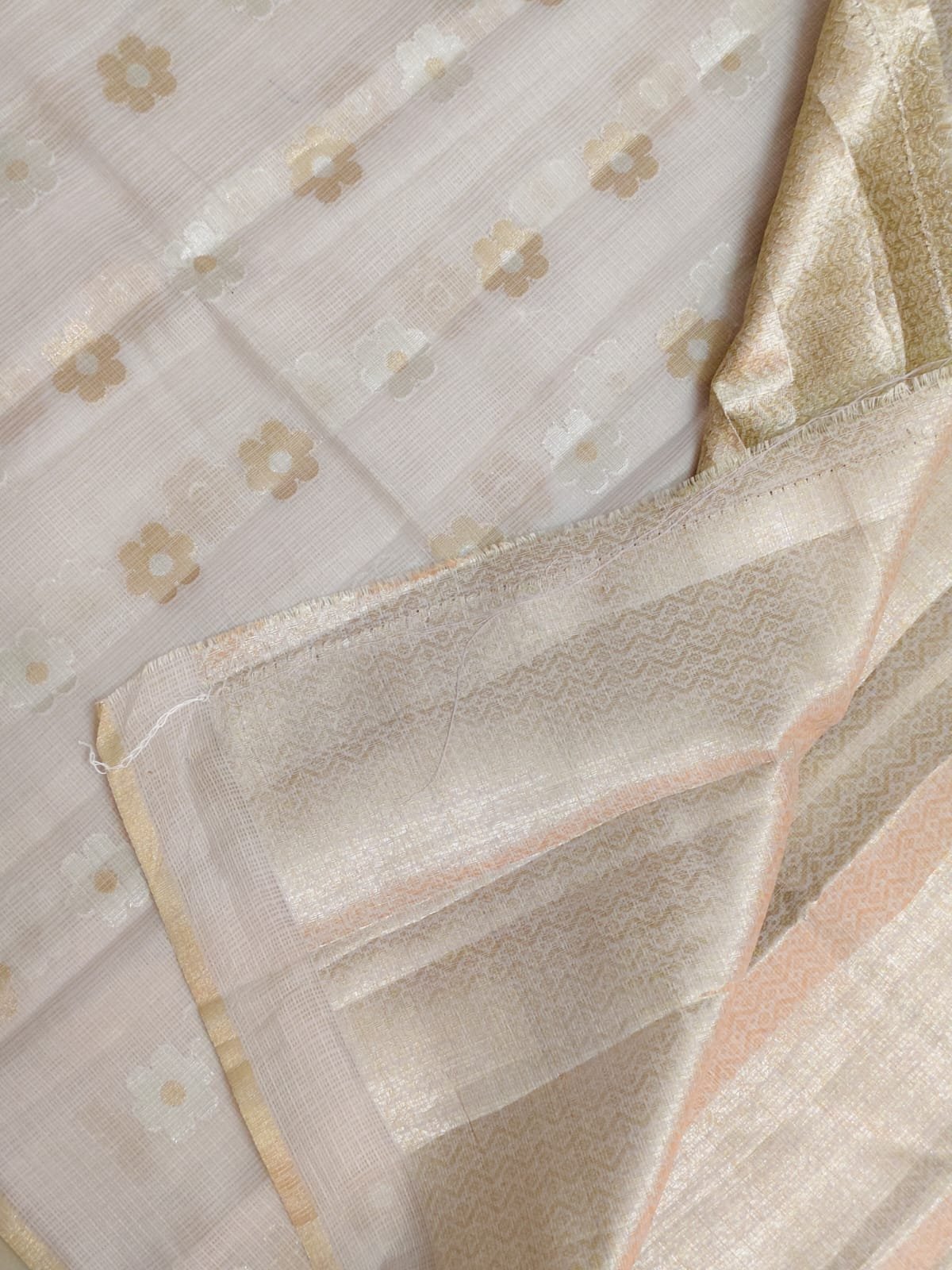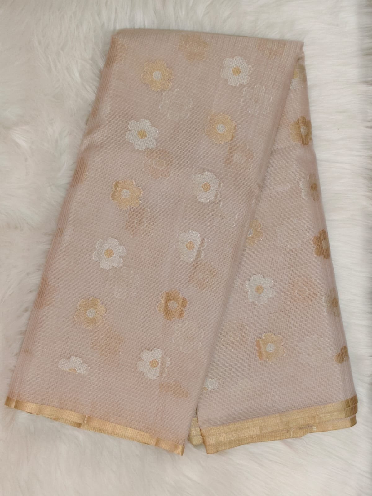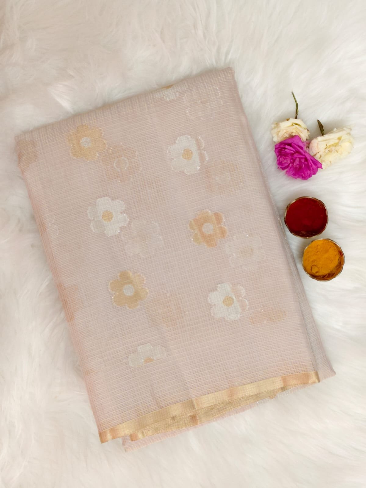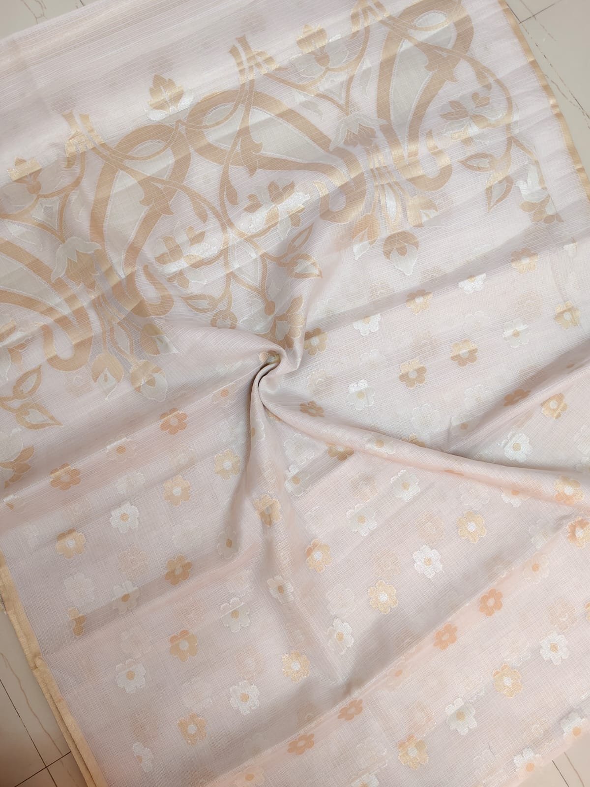 Add timeless grace to your ethnic wardrobe with this exquisite Kota silk saree, crafted to reflect understated elegance and traditional charm. Featuring a soothing soft peach base, the saree is beautifully adorned with subtle floral butta motifs woven in elegant gold and ivory tones, creating a refined and airy look.