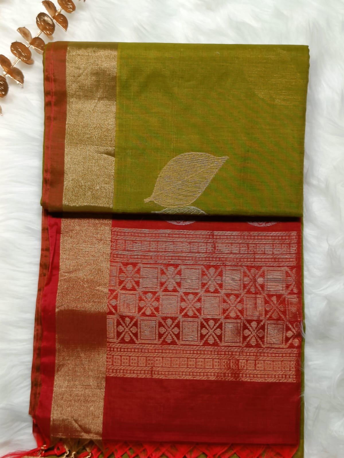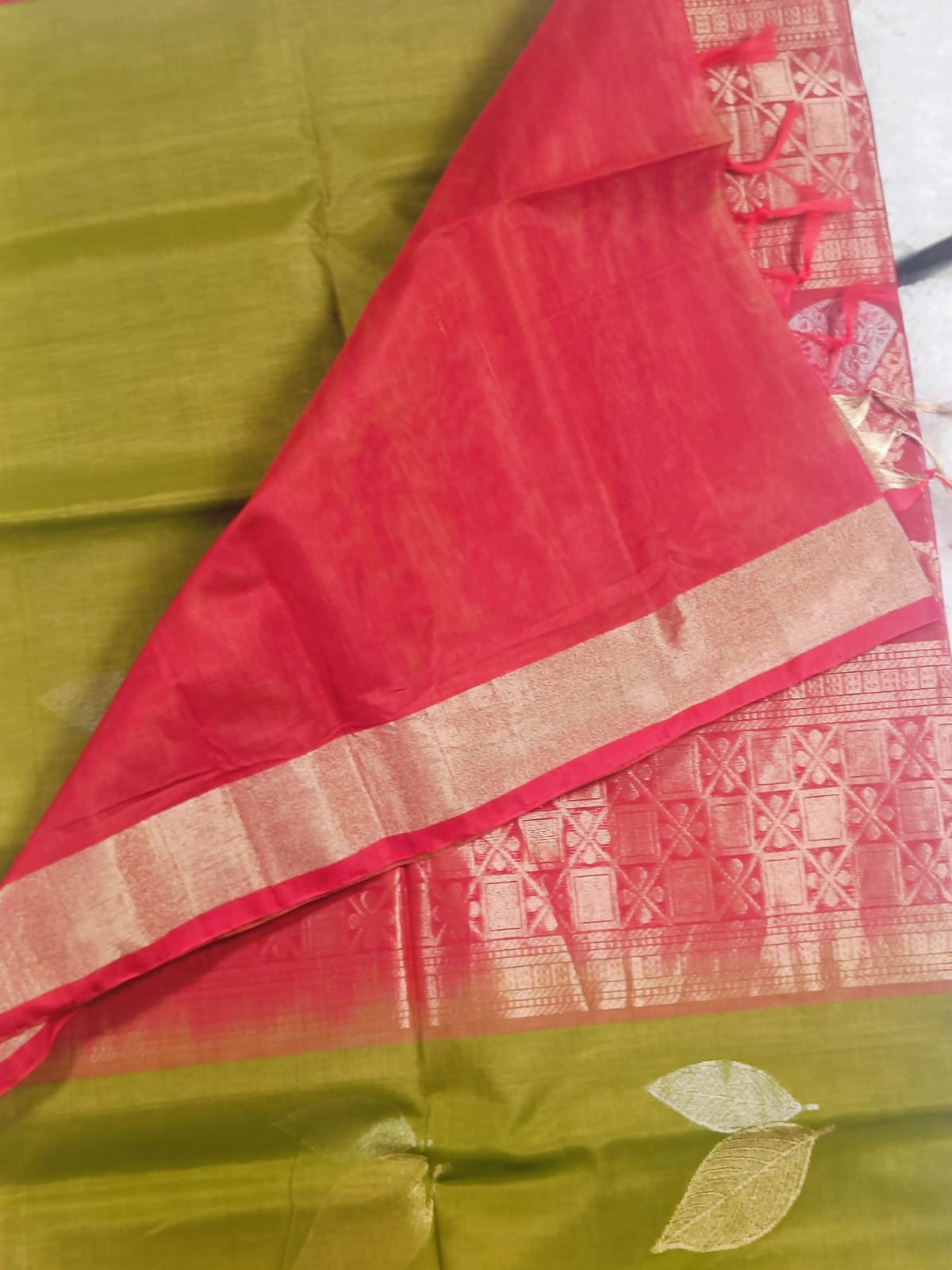 This saree is a stunning blend of rich contrast and traditional artistry. The body glows in olive green silk, softly lustrous with delicate woven motifs, including subtle golden leaf designs that add grace to its field. The pallu and borders shine in deep red, framed with fine golden edges for a regal touch.