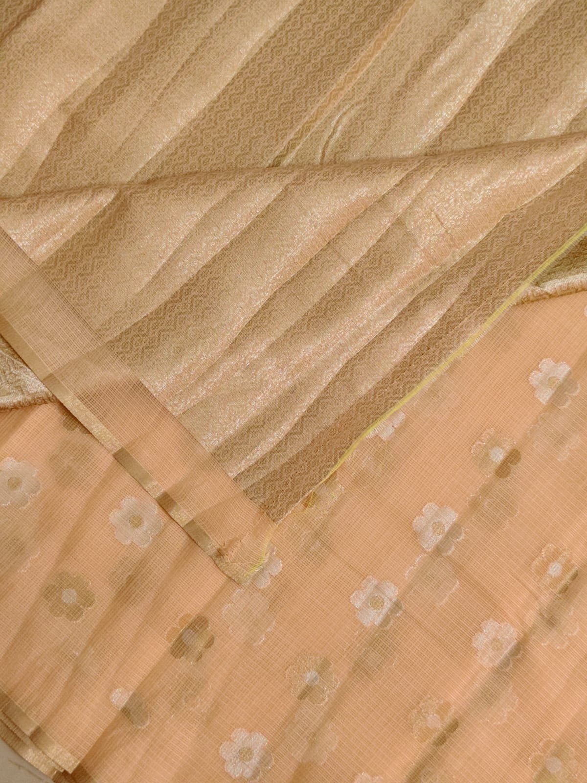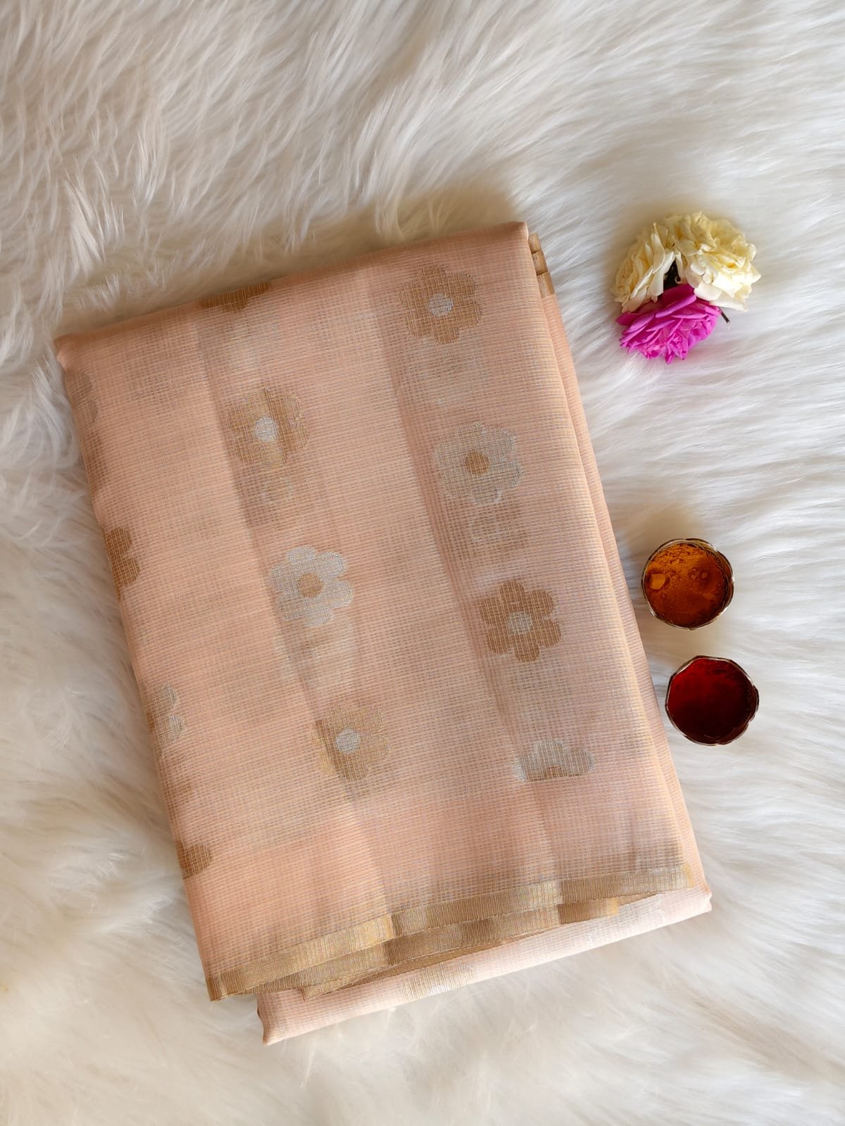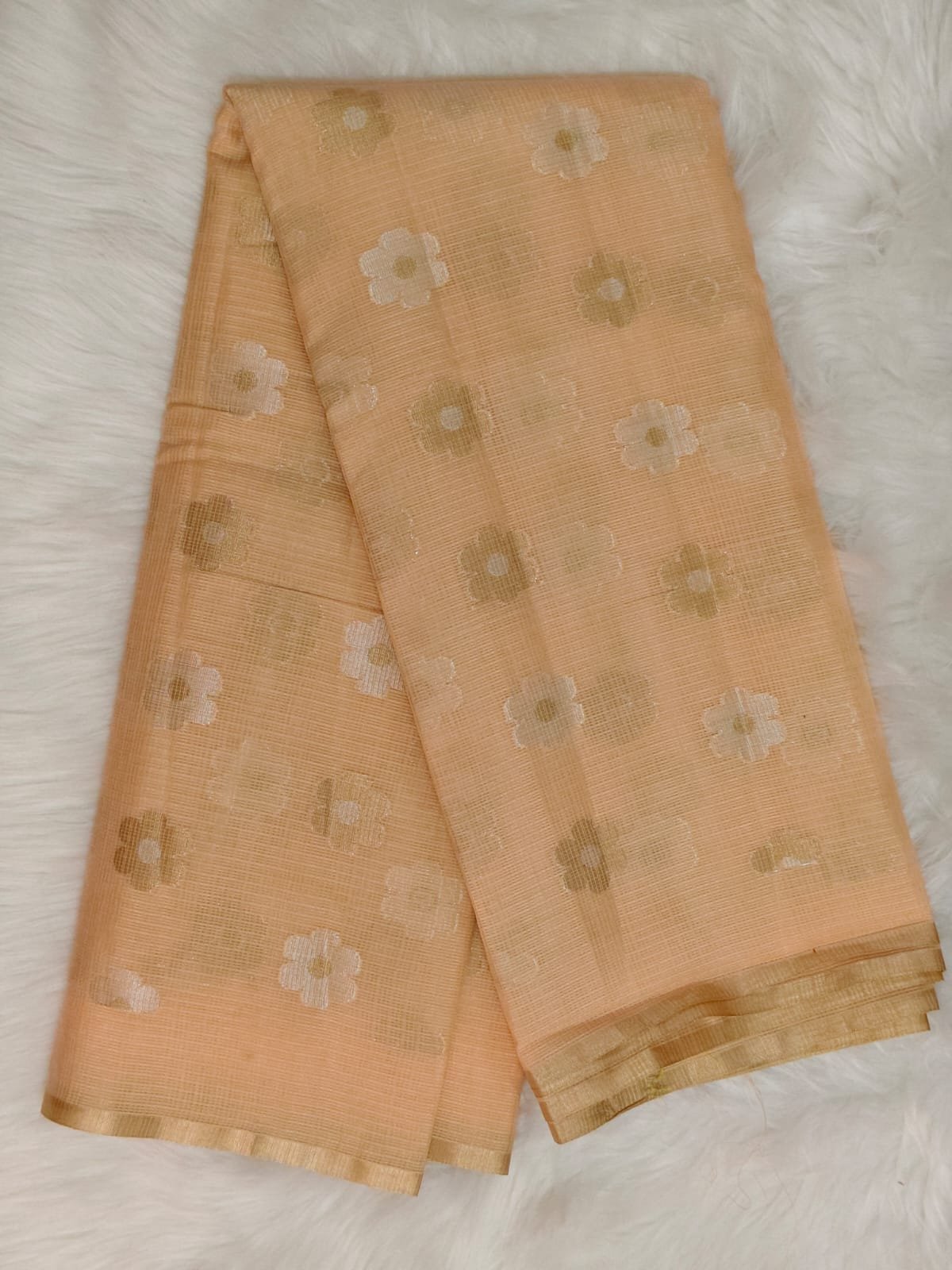 Add timeless grace to your ethnic wardrobe with this exquisite Kota silk saree, crafted to reflect understated elegance and traditional charm. Featuring a soothing soft peach base, the saree is beautifully adorned with subtle floral butta motifs woven in elegant gold and ivory tones, creating a refined and airy look.