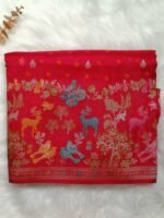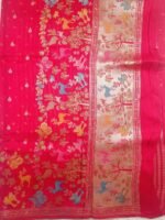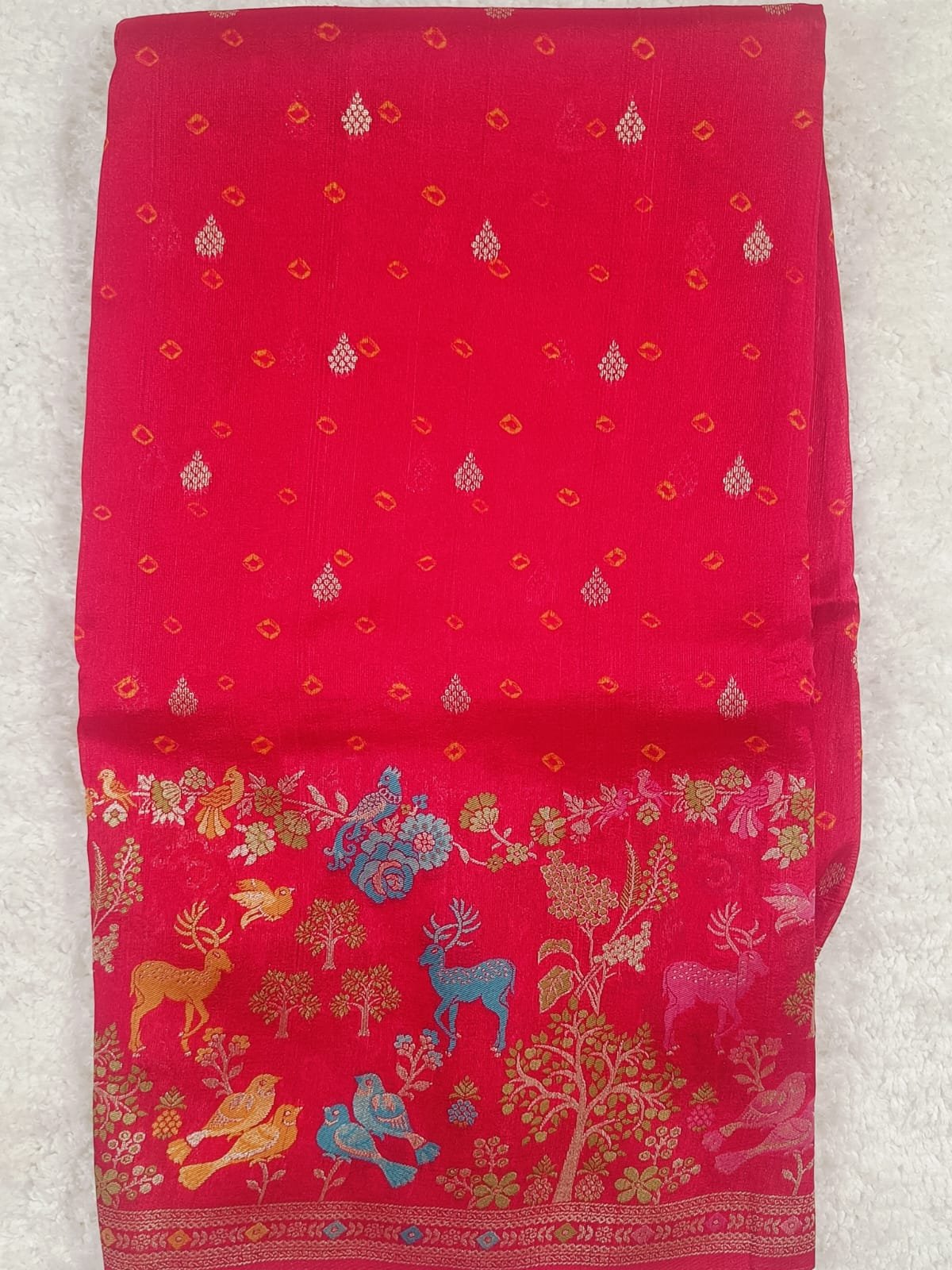 The highlight is its magnificent Shikargah border and pallu – an intricate woven panel depicting a lush forest scene with deer, peacocks, and parrots, brought to life in colorful Meenakari threadwork of green, yellow, pink, and blue. A shimmering metallic edge frames the pallu, giving it a regal finish.