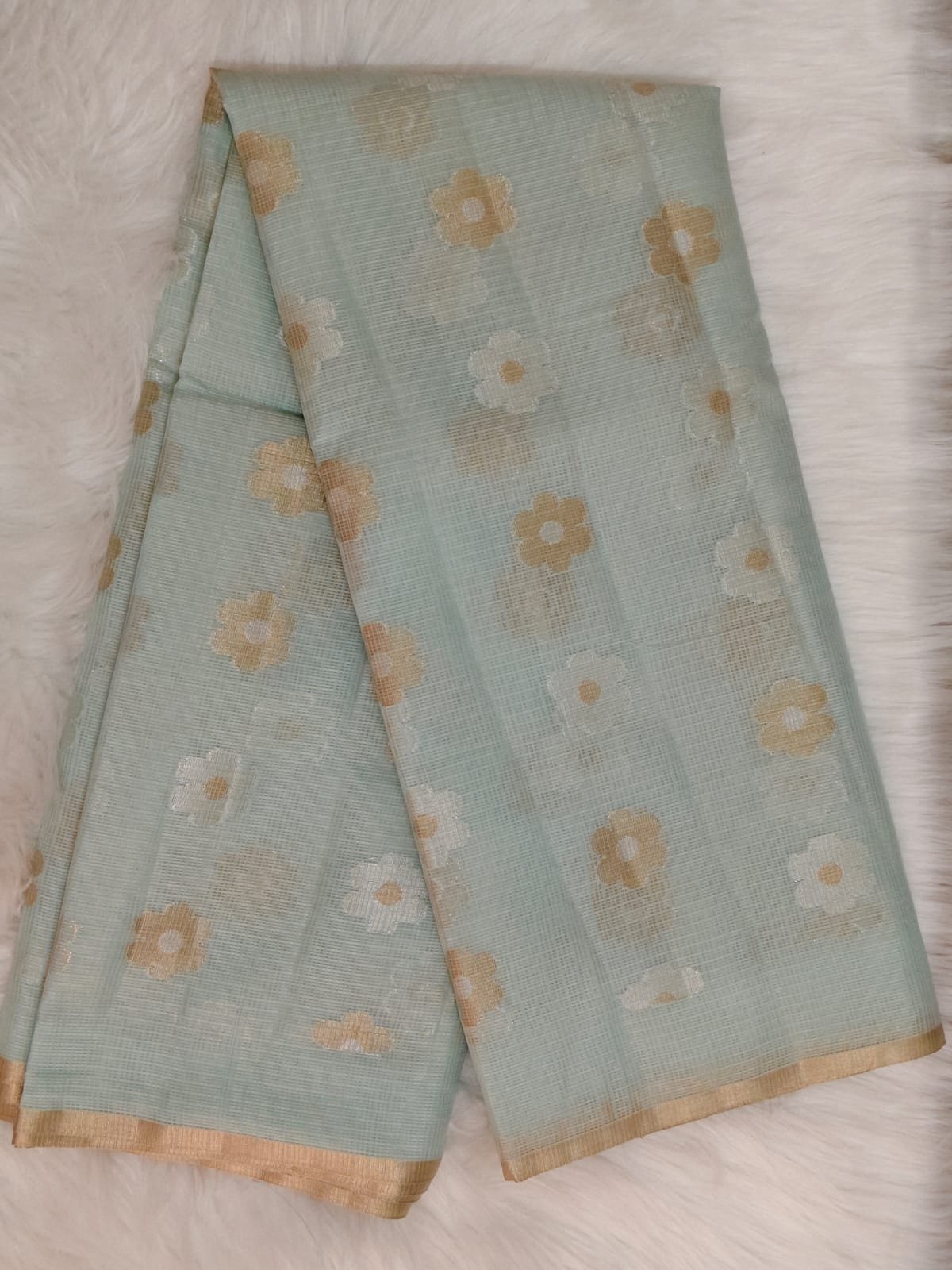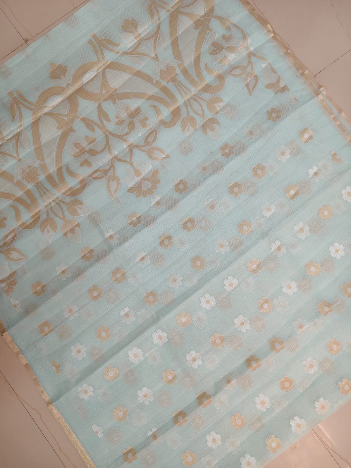 The highlight of this saree is its artistic floral pallu, woven with intricate vine-inspired patterns that add depth and sophistication without overpowering the softness of the fabric. Made from premium Kota silk, this saree is lightweight, breathable, and known for its signature fine square weave, making it perfect for long hours of comfortable wear.