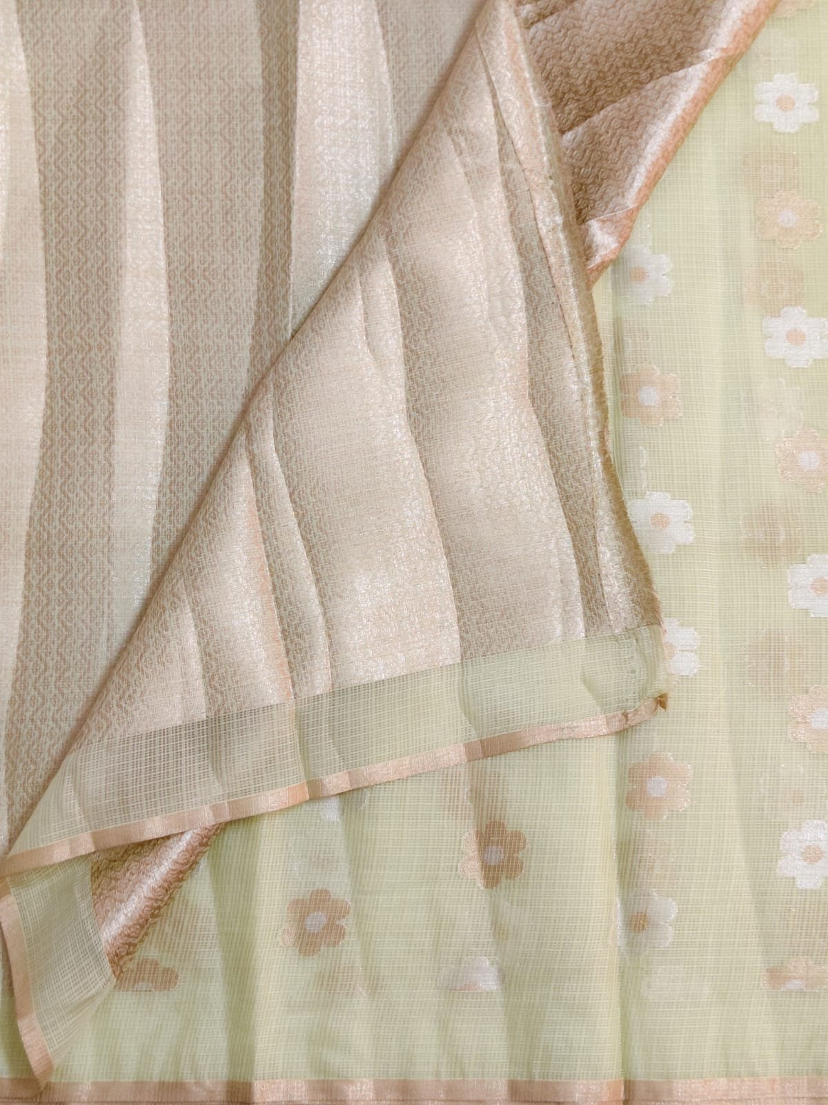 Add timeless grace to your ethnic wardrobe with this exquisite Kota silk saree, crafted to reflect understated elegance and traditional charm. Featuring a soothing soft peach base, the saree is beautifully adorned with subtle floral butta motifs woven in elegant gold and ivory tones, creating a refined and airy look.