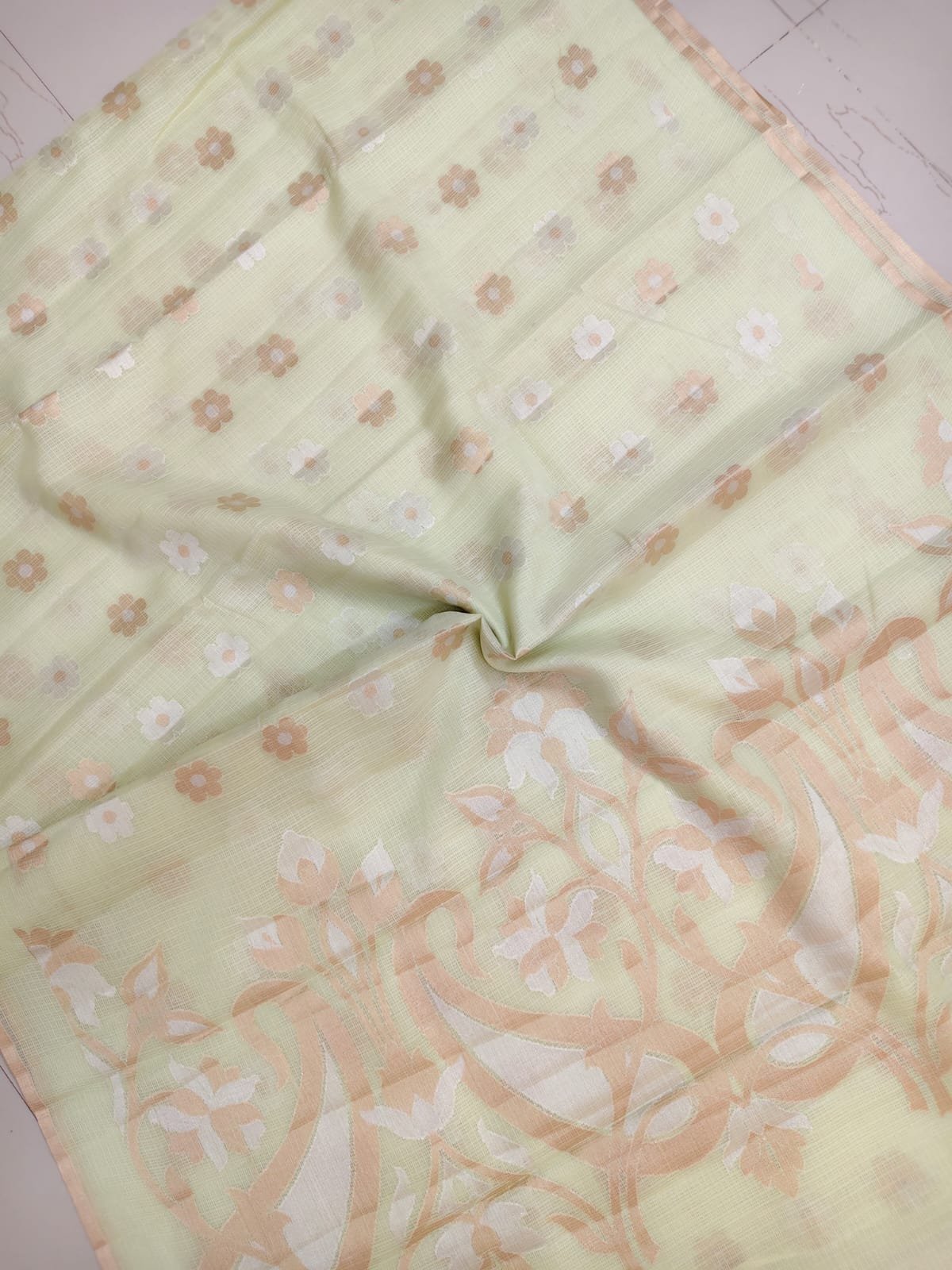 The highlight of this saree is its artistic floral pallu, woven with intricate vine-inspired patterns that add depth and sophistication without overpowering the softness of the fabric. Made from premium Kota silk, this saree is lightweight, breathable, and known for its signature fine square weave, making it perfect for long hours of comfortable wear.